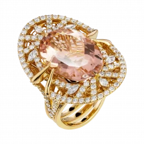 В центре композиции – морганит весом 67,02 карата, редкий природный минерал исключительной чистоты и утончённого сияния. Его мягкий оттенок переливается на грани персикового и розового, словно он вобрал тепло солнца и прозрачность рассветного неба. Подобные экземпляры встречаются в природе единично: каждый уникален по цвету и прозрачности.