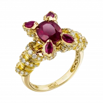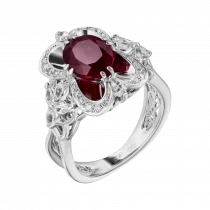 Окруженный ореолом из сорока бриллиантов, алый самоцвет искрится множеством ярких огней, которые подчеркивают его насыщенный цвет и придают украшению особенное величие.