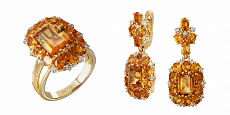 Лаконичная глянцевая оправа, трио восторженных цитринов общим весом 5,68 карат и целая россыпь спессартинов медового цвета создают удивительную золотую картину, со вкусом разбавленную бриллиантовыми каплями, только подчеркивающими насыщенный оттенок остальных кристаллов, символизирующих тепло, сияние, богатство, красоту, славу, победу, мудрость и опыт.