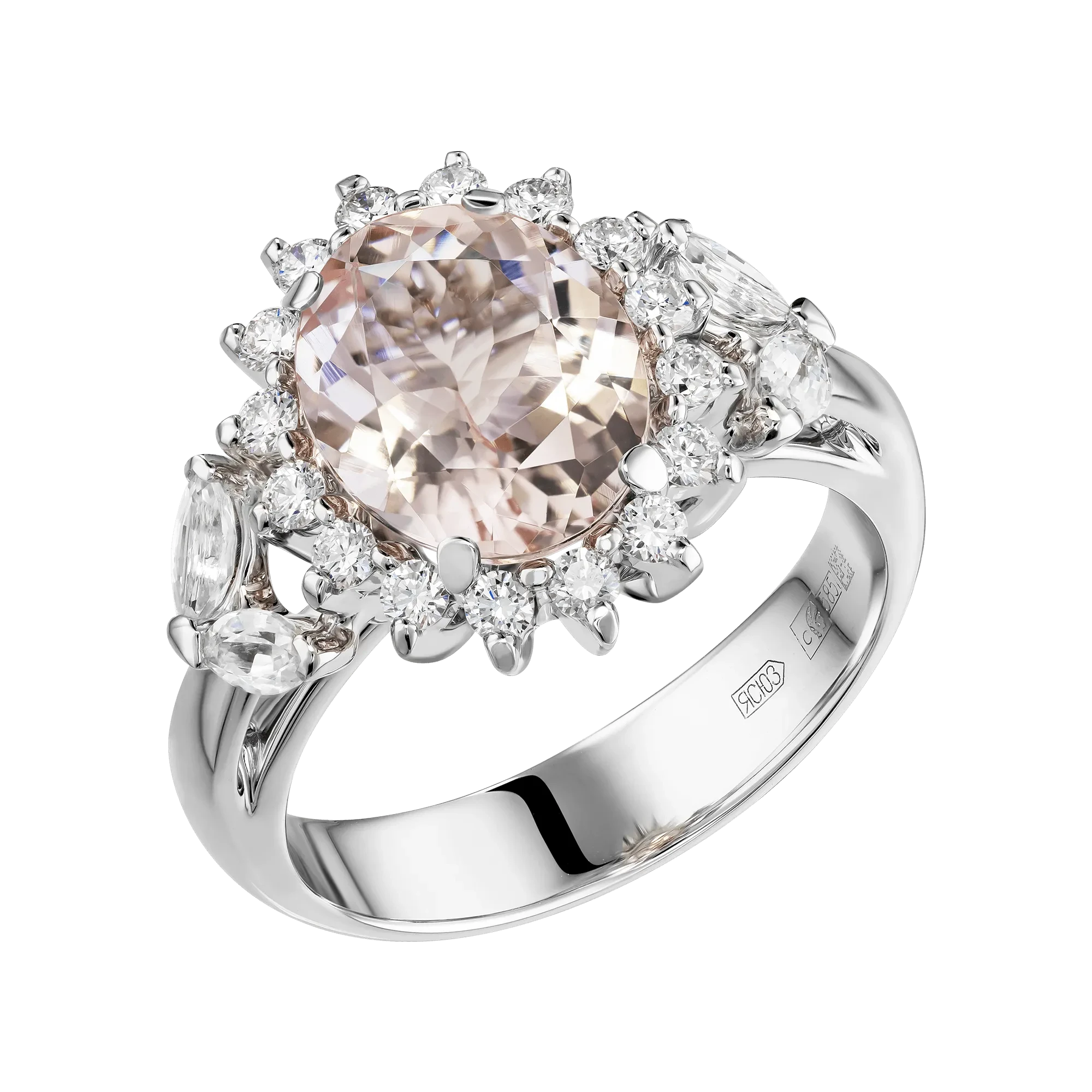 Композиция гарнитура выстроена как распустившееся соцветие. В центре каждого украшения — нежнейшие пудровые морганиты, излучающие мягкое, тёплое сияние, словно дыхание цветка. Их оттенок звучит тонко и благородно, создавая ощущение хрупкости и внутреннего света. Лепестки выполнены из белых сапфиров, чья прозрачность и чистота подчёркивают форму цветка и придают композиции воздушность. Белое золото образует изящный каркас, повторяющий естественные линии живого растения.