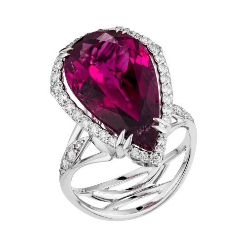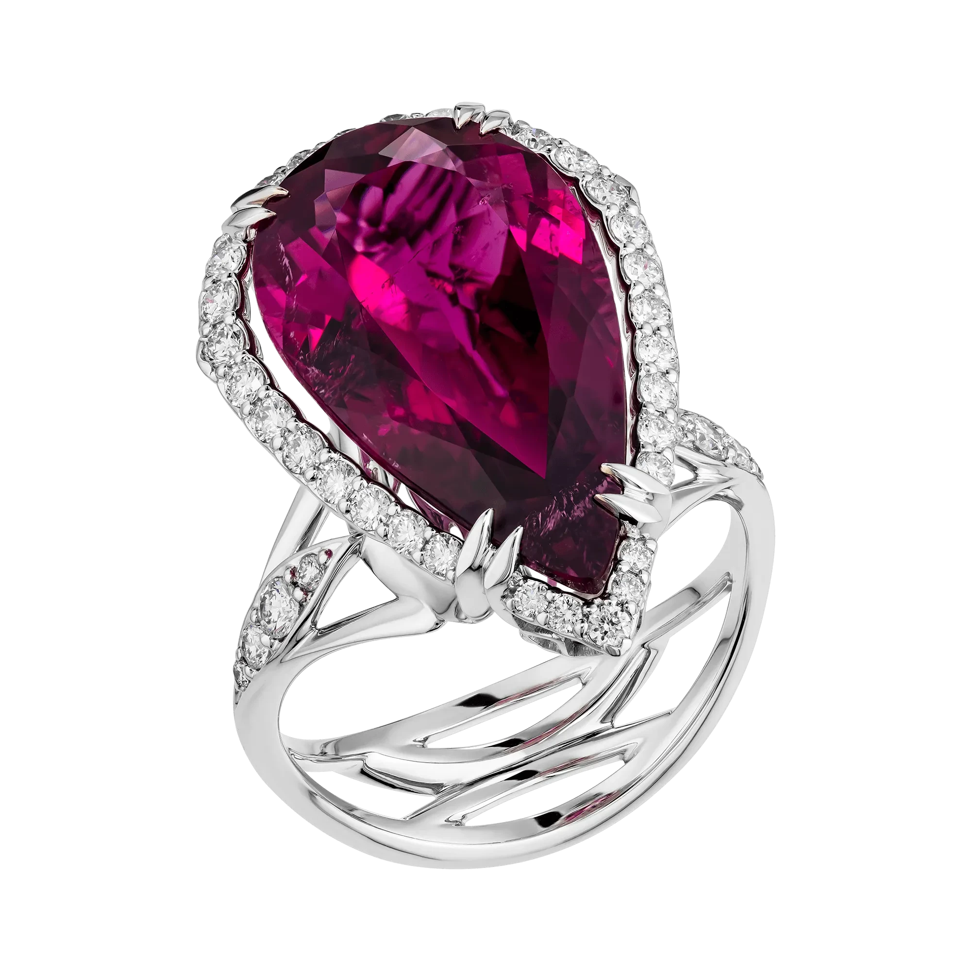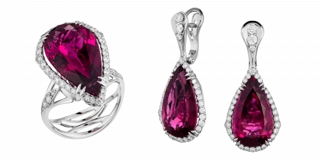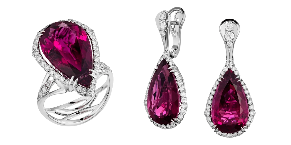 Гарнитур «Чарующим цветом» построен вокруг трёх уникальных турмалинов общим весом 33,51 карат, добытых в Бразилии – стране, чьи недра подарили миру одни из самых завораживающих самоцветов. Их оттенок невозможно описать одним словом: он соединяет в себе густое вино, гранатовую плотность и пурпурную страсть закатного неба.