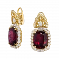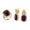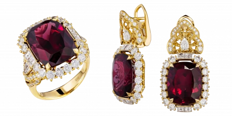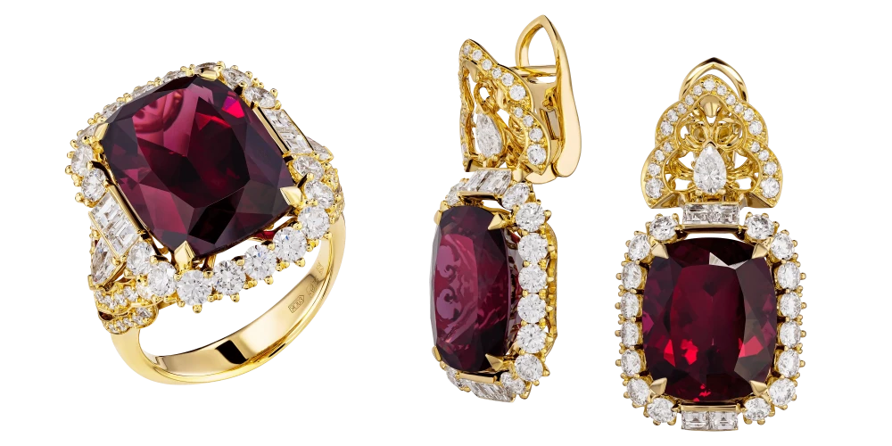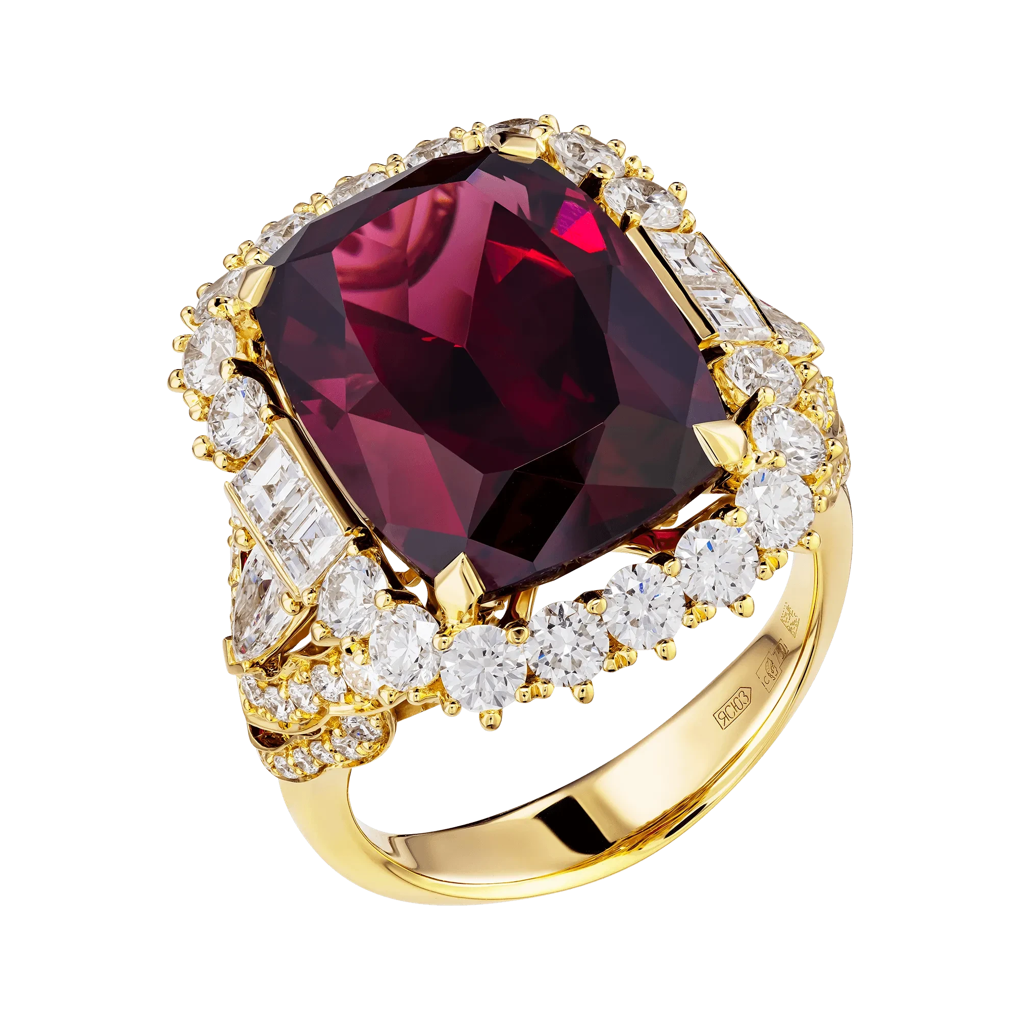 Центральное звучание принадлежит родолитам общим весом 46,19 карат – насыщенным, глубоким, с винно-пряным оттенком. Эти самоцветы словно вобрали в себя жар пустыни и прохладу дворцовых садов. В кольце крупный камень обрамлён бриллиантами и уравновешен архитектурной симметрией.