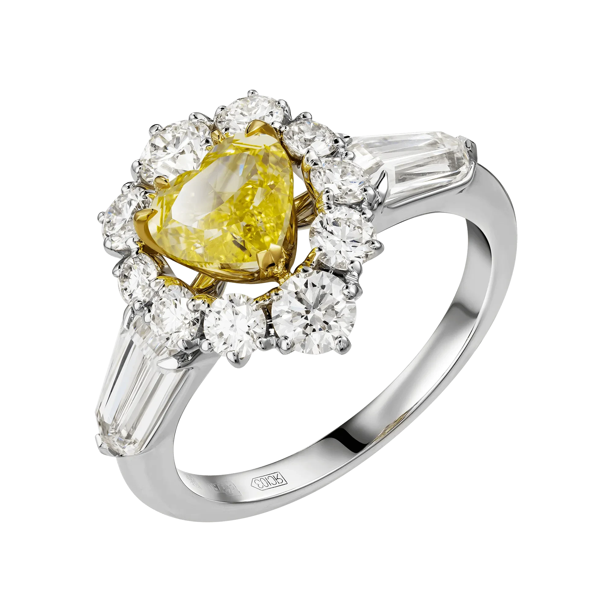В обрамлении белого золота и россыпи бриллиантов различных огранок жёлтые сердца раскрываются особенно ярко. Контраст холодного сияния и тёплого света рождает гармонию, в которой материальное соединяется с духовным. Гарнитур становится символом преданности, нежности и внутреннего сияния, что всегда ведёт к исполнению желаний, дорогих сердцу.
