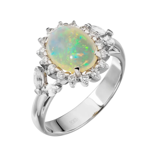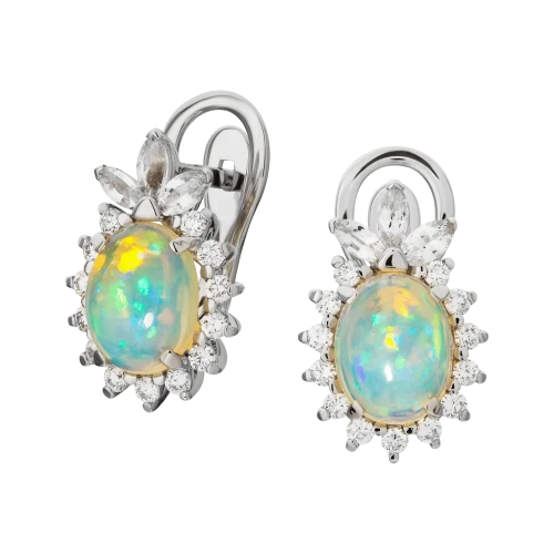 В основе композиции – эфиопские опалы, знаменитые своей волшебной игрой цвета. Их поверхность оживает при каждом повороте, переливаясь молочно-голубыми, янтарными и розово-золотыми оттенками. Яркая опалесценция напоминает игру света на картинах импрессионистов – тонкую, трепетную, свободную от статичности.
