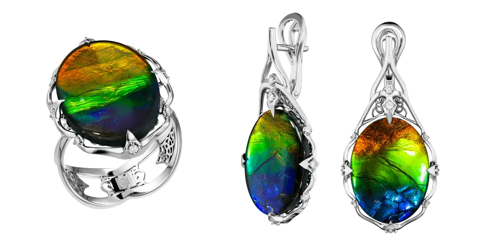 Гарнитур «Хроники света» создан вокруг одного из самых редких и необычных органических самоцветов в ювелирном мире — аммолита. Эти камни образованы из ископаемых раковин аммонитов возрастом более 70 миллионов лет и добываются исключительно в Канаде, в регионе Альберта, который признан единственным промышленным источником ювелирного аммолита в мире.