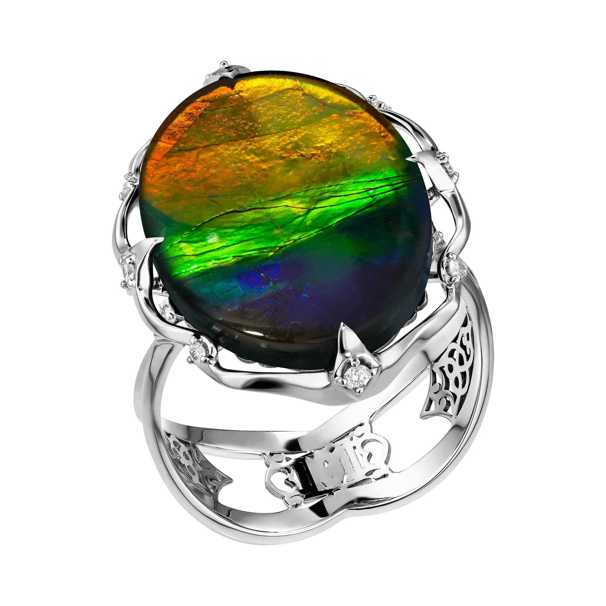 Главная ценность аммолита заключается в его уникальной оптической природе. В отличие от традиционных драгоценных камней, цвет здесь рождается не пигментом, а тончайшей слоистой структурой арагонита, которая преломляет свет и создаёт насыщенную иризацию. В одном камне могут одновременно присутствовать зелёные, синие, жёлтые и огненно-красные спектры, меняющиеся в зависимости от угла зрения. Такая игра цвета делает каждый аммолит абсолютно неповторимым — два идентичных экземпляра в природе не существуют.