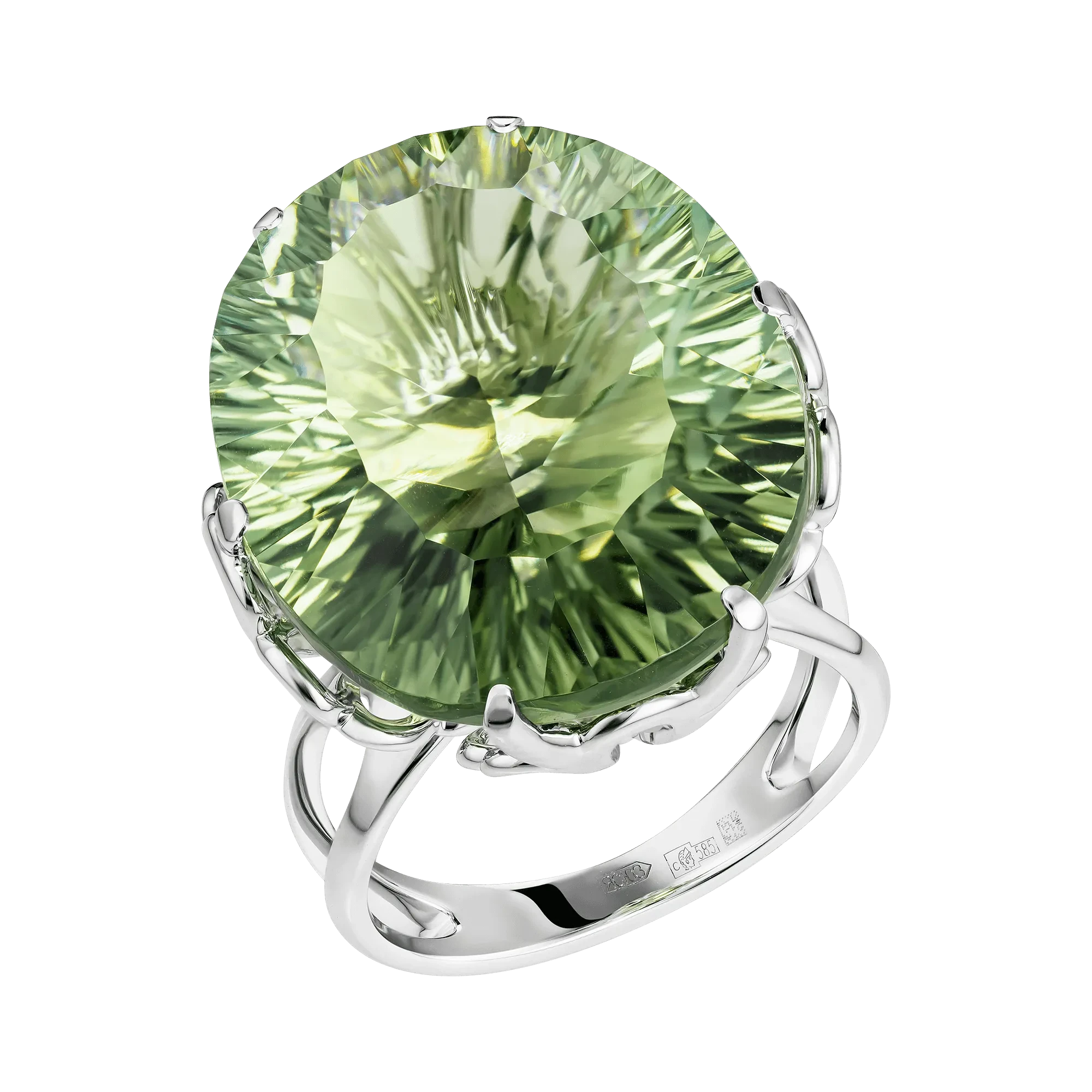 Празиолит — разновидность кварца, ценимая за чистоту кристалла и тонкий световой характер. Его природная палитра варьируется от прозрачного мятного до насыщенного оливково-зелёного тона. Особенно востребованы камни с равномерным цветом и высокой степенью прозрачности, поскольку именно эти качества позволяют свету проходить сквозь минерал свободно и создавать ощущение глубины без утяжеления оттенка. В данном гарнитуре празиолиты демонстрируют деликатную, спокойную игру света, не яркую, а созерцательную.