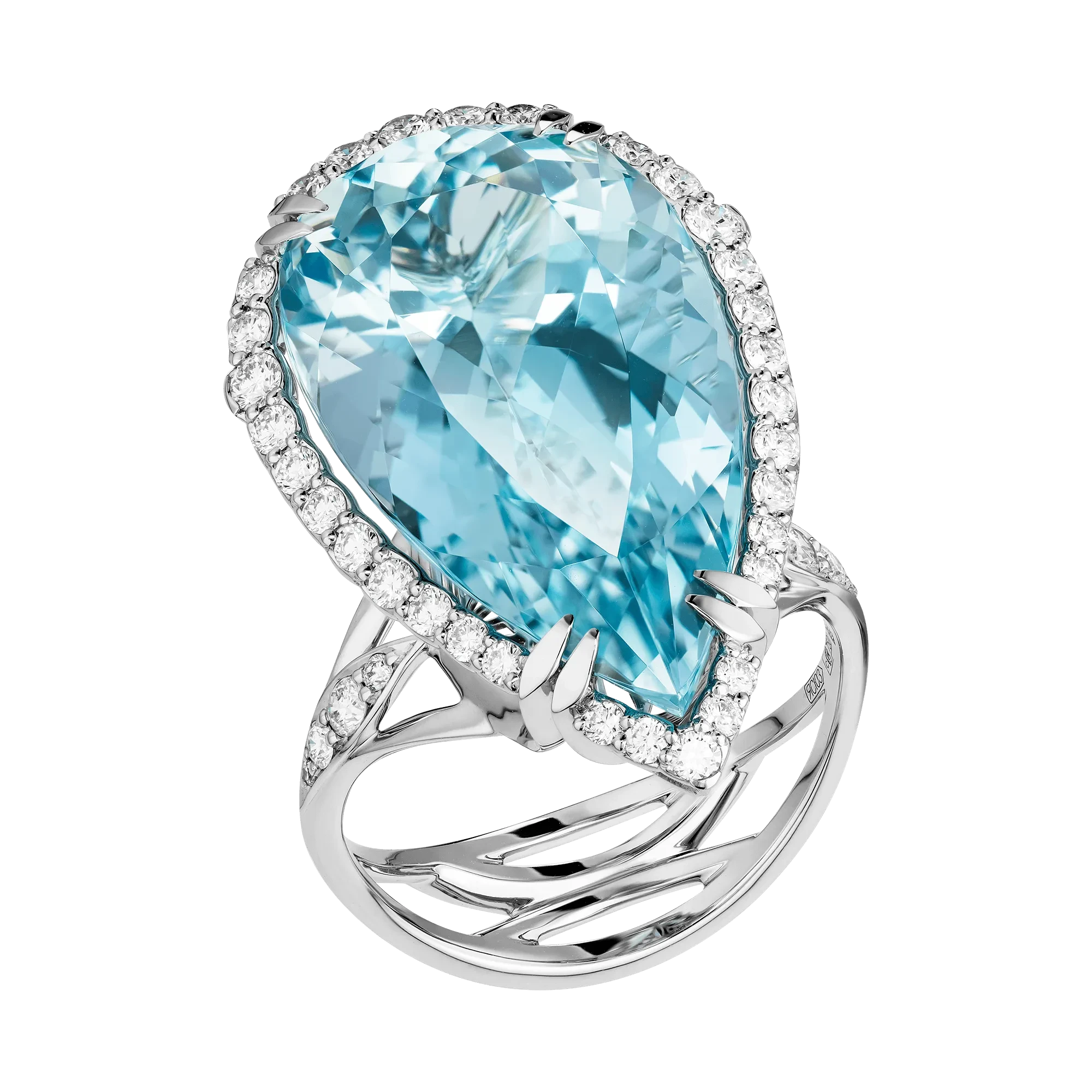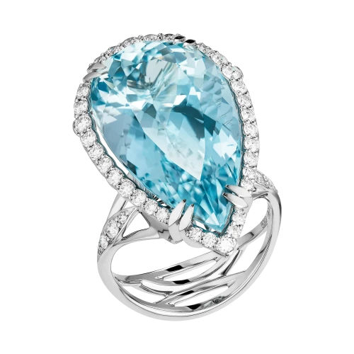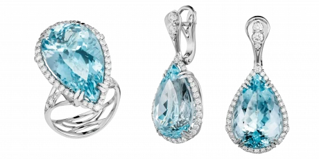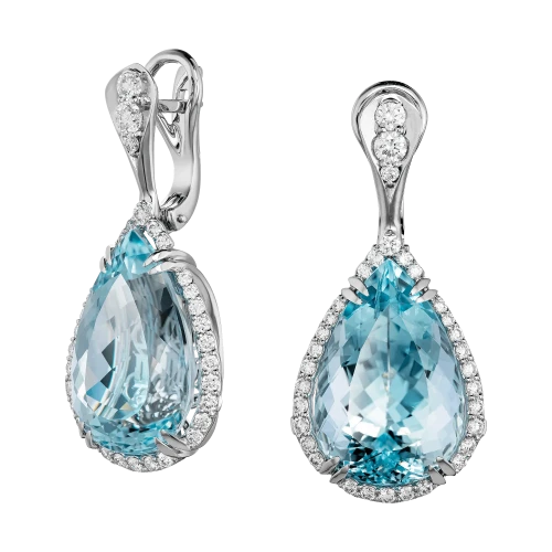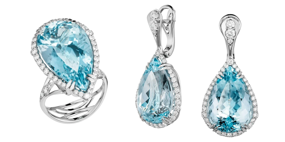 Огранённые в изящные грушевидные формы, аквамарины создают эффект текучести, будто повторяя траекторию падающей капли. Свет проникает внутрь самоцветов, а затем мягко возвращается наружу, усиливая ощущение глубины. Их оттенок – это не просто голубизна, в нём живёт лёгкая дымка, отражение неба и вкус ледяной воды из родника. Оправы из белого золота создают архитектуру невесомости, где линии изогнуты, как лёгкий ветер, а тонкая россыпь бриллиантов добавляет искристый ритм.