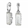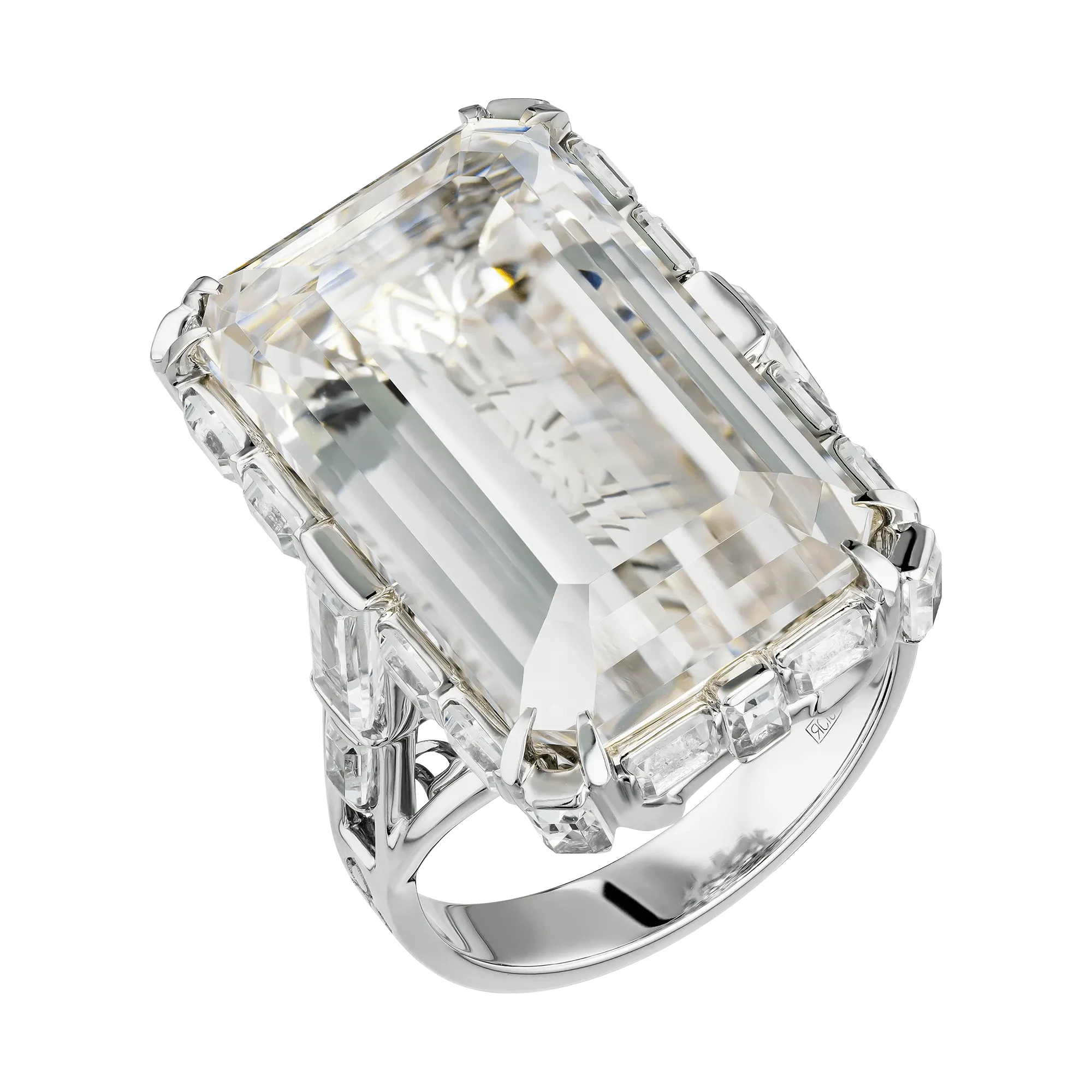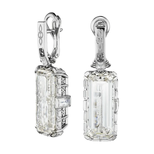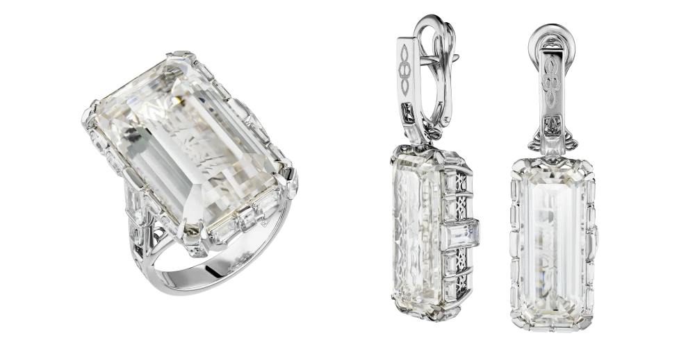 Ажурная архитектура оправы из белого золота становится ключевым художественным приёмом: сложный, точно выверенный рисунок линий проявляется сквозь прозрачность камней, напоминая морозный узор на стекле — тонкий, структурный, почти графический. Такое решение требует высочайшей точности исполнения, поскольку даже минимальное отклонение в пропорциях нарушило бы визуальную чистоту композиции.