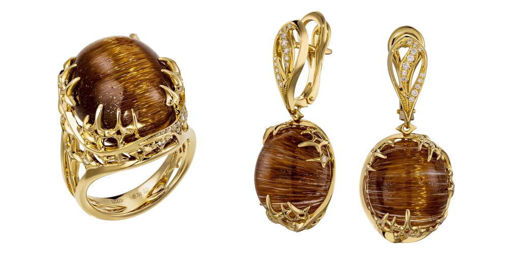 Большинство этих самоцветов отличается не только изощренным природным рисунком, но и довольно крупными размерами. Это позволило мастерам Maxim Demidov создать представительный и, одновременно, изящный ювелирный сет, в котором владелица всегда будет на виду.