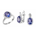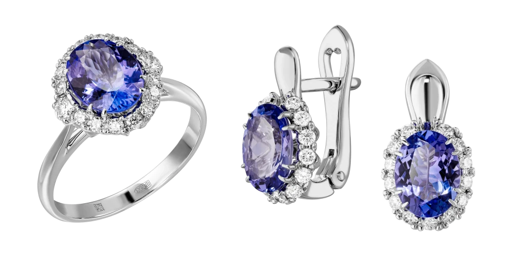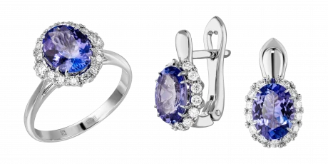 Отождествляя гарнитур с очень современным украшением, мастера выбрали в качестве главного акцента юные по меркам самоцветов танзаниты. Их уникальную способность – демонстрировать все оттенки бескрайней синевы, призваны подчеркнуть множественные бриллианты, расположенные аккуратным сводом вокруг центральных сокровищ.