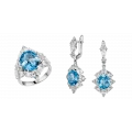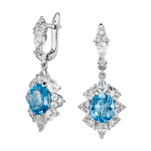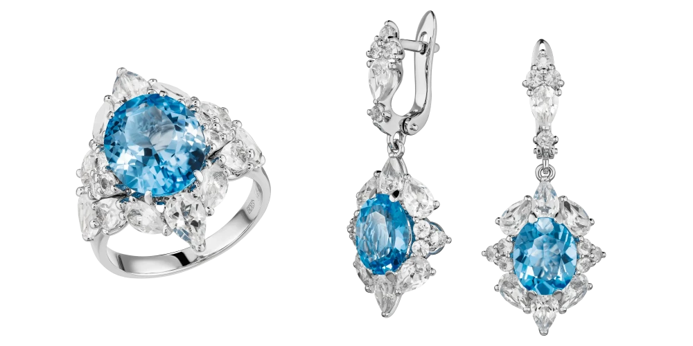 Вокруг крупных топазов рассыпаны белые сапфиры и топазы разных огранок, усиливающие игру бликов и создающие впечатление мерцающего инея. Белое золото оправы придаёт композиции холодное благородство и завершённую чистоту формы, словно кристалл, выточенный самой природой.