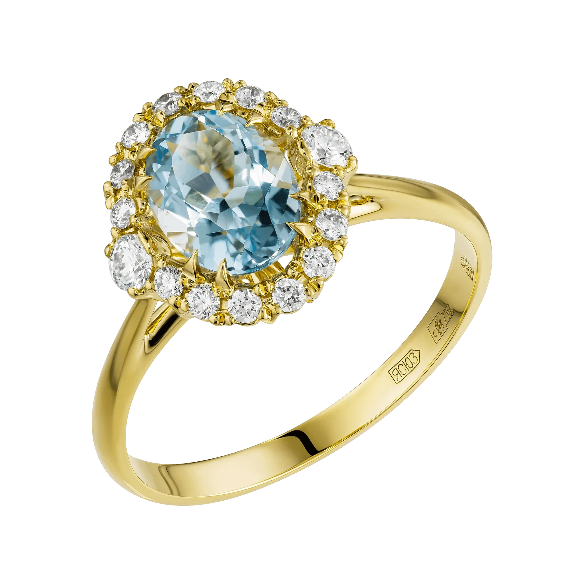 Бразильские аквамарины несут в себе прозрачную голубизну, наполненную свежестью и светом. Их оттенок напоминает чистое утреннее небо, где каждая грань отражает ощущение лёгкости и свободы. Ореол из бриллиантов усиливает это впечатление, создавая вокруг центральных камней мягкое свечение — словно тонкий световой ореол, обнимающий форму и подчёркивающий её воздушность.