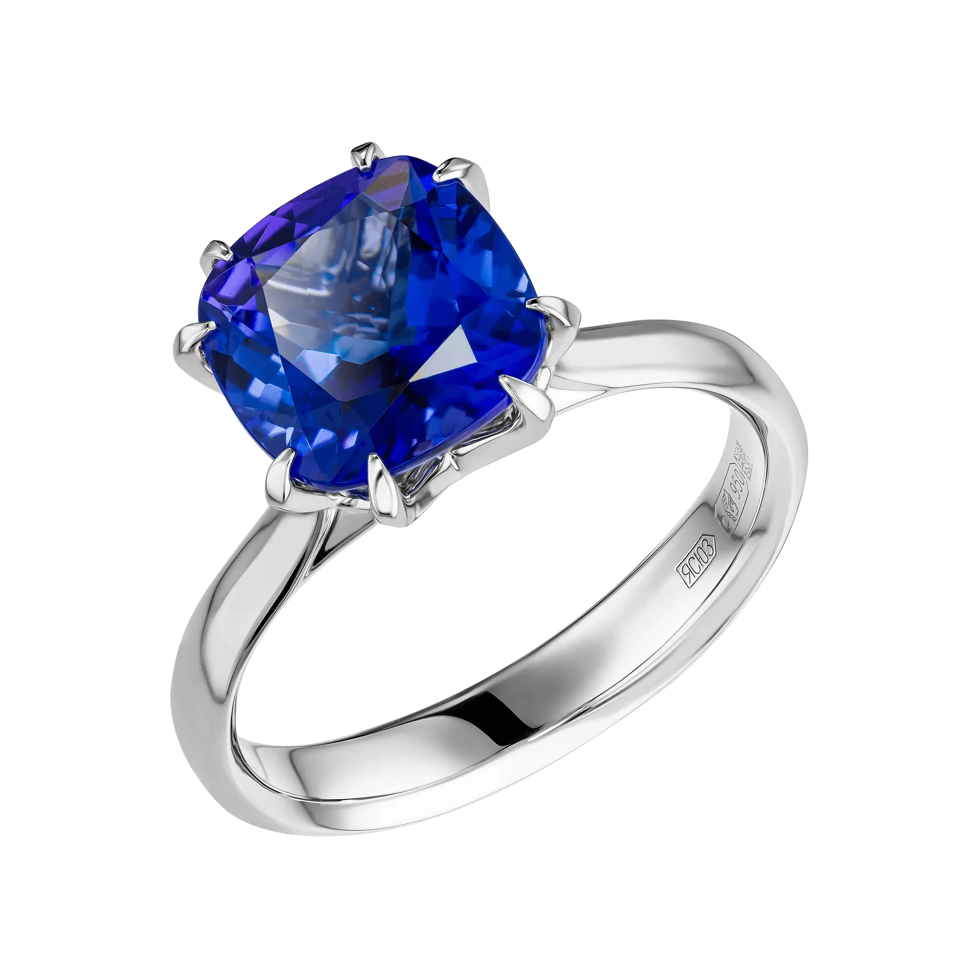 Насыщенно-синие танзаниты образуют центр композиции, притягивая внимание глубиной оттенка и благородной оптической плотностью. Их цвет — бархатный, сложный, с тонкими фиолетовыми нюансами — раскрывается постепенно, создавая эффект живого отражения. Высокое качество огранки усиливает игру света, позволяя камням словно «откликаться» на движение и менять характер сияния в зависимости от угла взгляда.