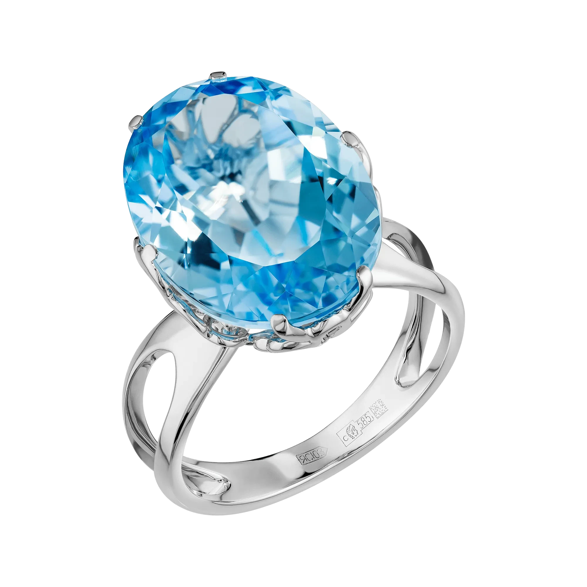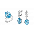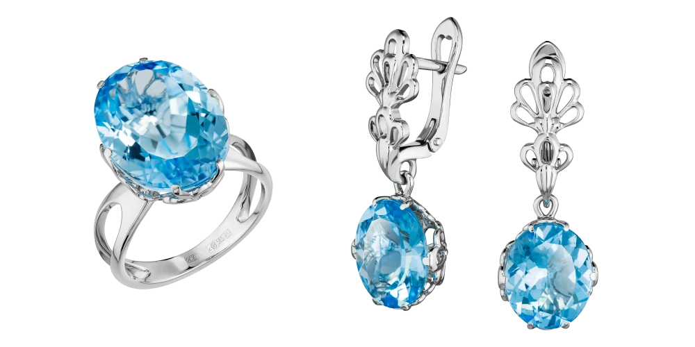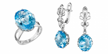 Оправа из белого золота выстроена лаконично и современно. Чёткие линии и аккуратная посадка камней создают архитектурную чистоту формы, где главный акцент — цвет и его вибрация. В серьгах топазы работают в динамике, откликаясь на движение лёгкими бликами, а кольцо становится центром композиции — выразительным, но не перегруженным.