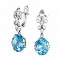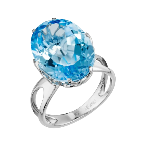 В центре композиции — крупные бразильские топазы общим весом 24,99 карата. Их чистый голубой оттенок напоминает прозрачную воду в движении или утренний воздух у океана. Камни обладают высокой светопроницаемостью, благодаря чему внутри создаётся эффект кристальной глубины. Свет проходит сквозь грани, усиливая ощущение прозрачности и объёма — словно каждый топаз наполнен собственной энергией света.