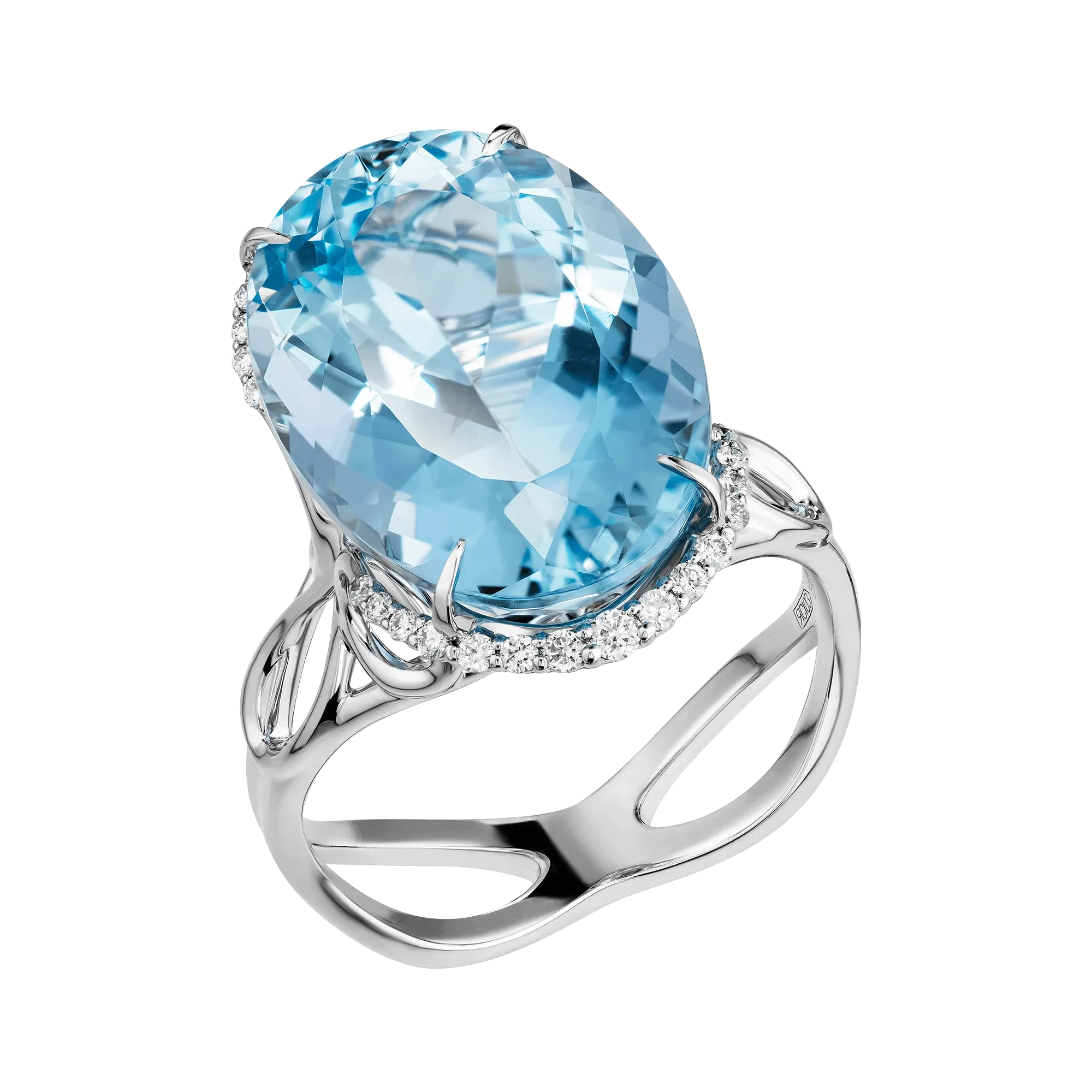 Центральные камни – аквамарины общим весом 39,18 карат кажутся застывшими фрагментами неба. Их оттенок приближается к акварельной голубизне и растворяется в холодном сиянии воды на рассвете. Благодаря идеальной огранке, каждая грань ловит свет мягко и глубоко, отражая внутреннюю ясность.