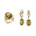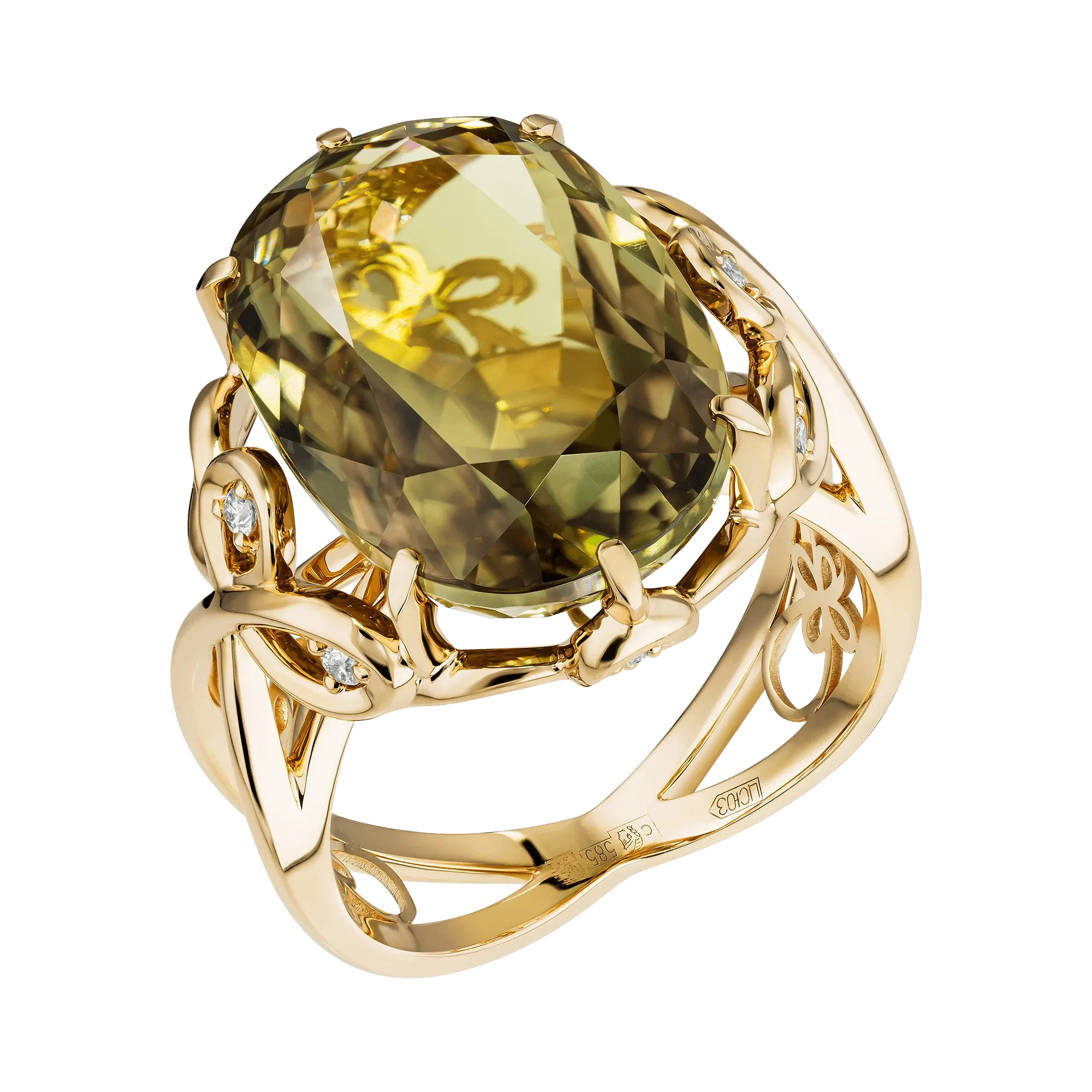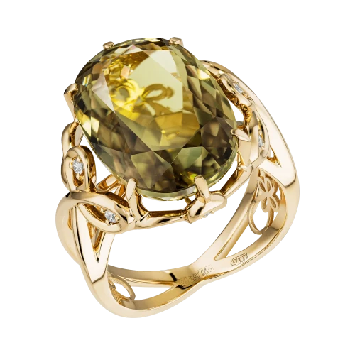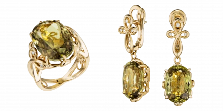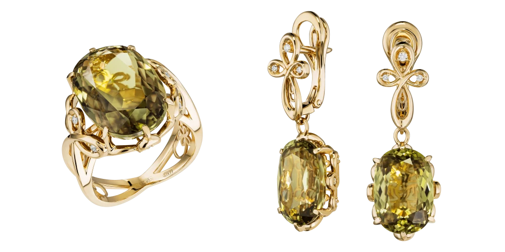 Центральными элементами композиции стали султаниты, отличающиеся сложной природной палитрой и оптической изменчивостью. Камни демонстрируют переходы от медово-золотистых и оливковых тонов к более насыщенным оттенкам в зависимости от освещения. Такой эффект обусловлен внутренней структурой минерала и считается одной из его ключевых характеристик. Ограниченность добычи и нестабильность качественных образцов делают султаниты предметом интереса преимущественно для коллекционеров и профессионального сообщества.