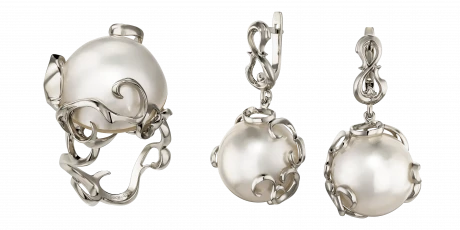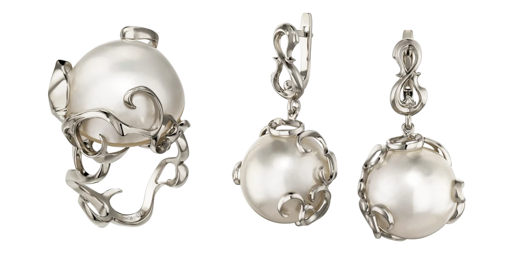 Через призму такой художественной аналогии игристого напитка и даров глубин как признаков высшего общества, очень гармонично воспринимается ювелирный сет из белого золота. Жемчужины мастера Maxim Demidov поместили в чрезвычайно изящные оправы. Три легких пузырька общим весом 78,89 карат, напоминающих об игре благородного напитка в бокале, будто летят ввысь, презирая законы тяготения.