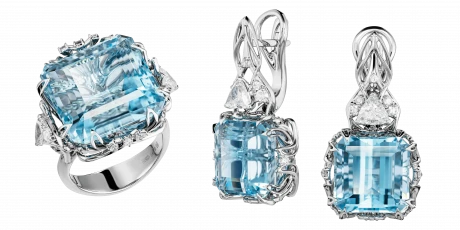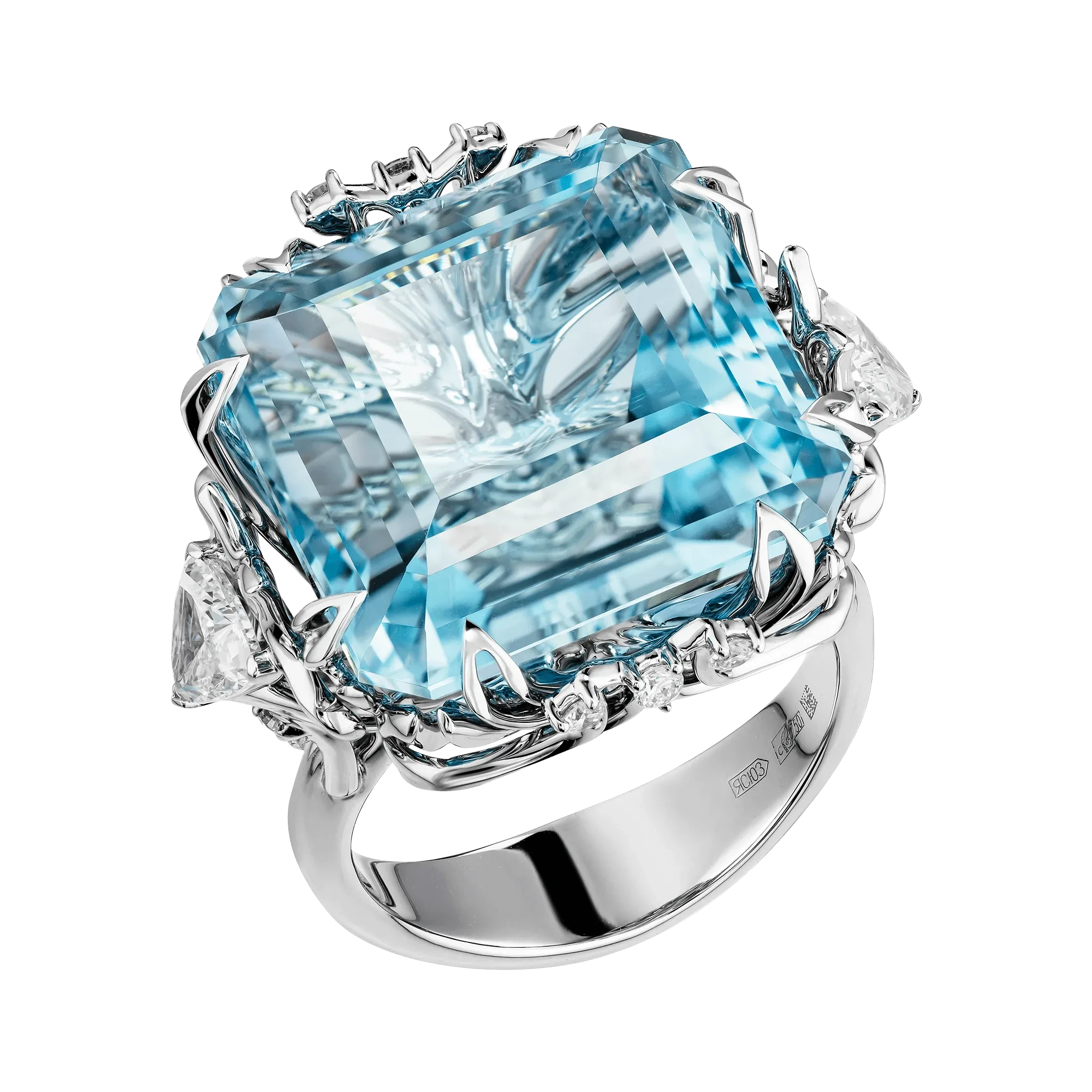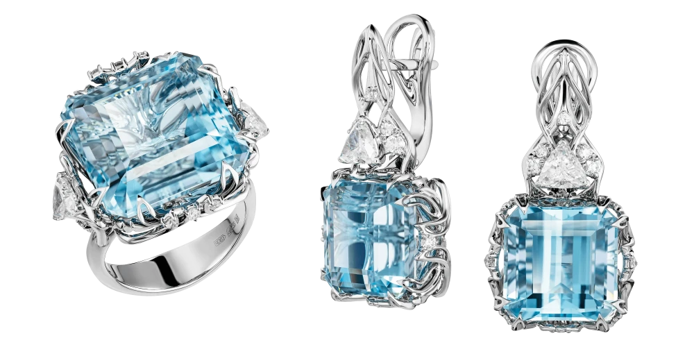 Крупные аквамарины, огранённые с почти архитектурной точностью, становятся окнами в иное пространство. Их небесный цвет – не просто голубой, а прозрачный, как свежий воздух на рассвете. Внутри драгоценных камней словно сохранились отражения безоблачного горизонта, движения ветра, тишины высоты. Свет проникает в каждую грань, отражается и возвращается наружу не сиянием, а дыханием неба.