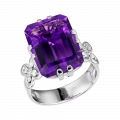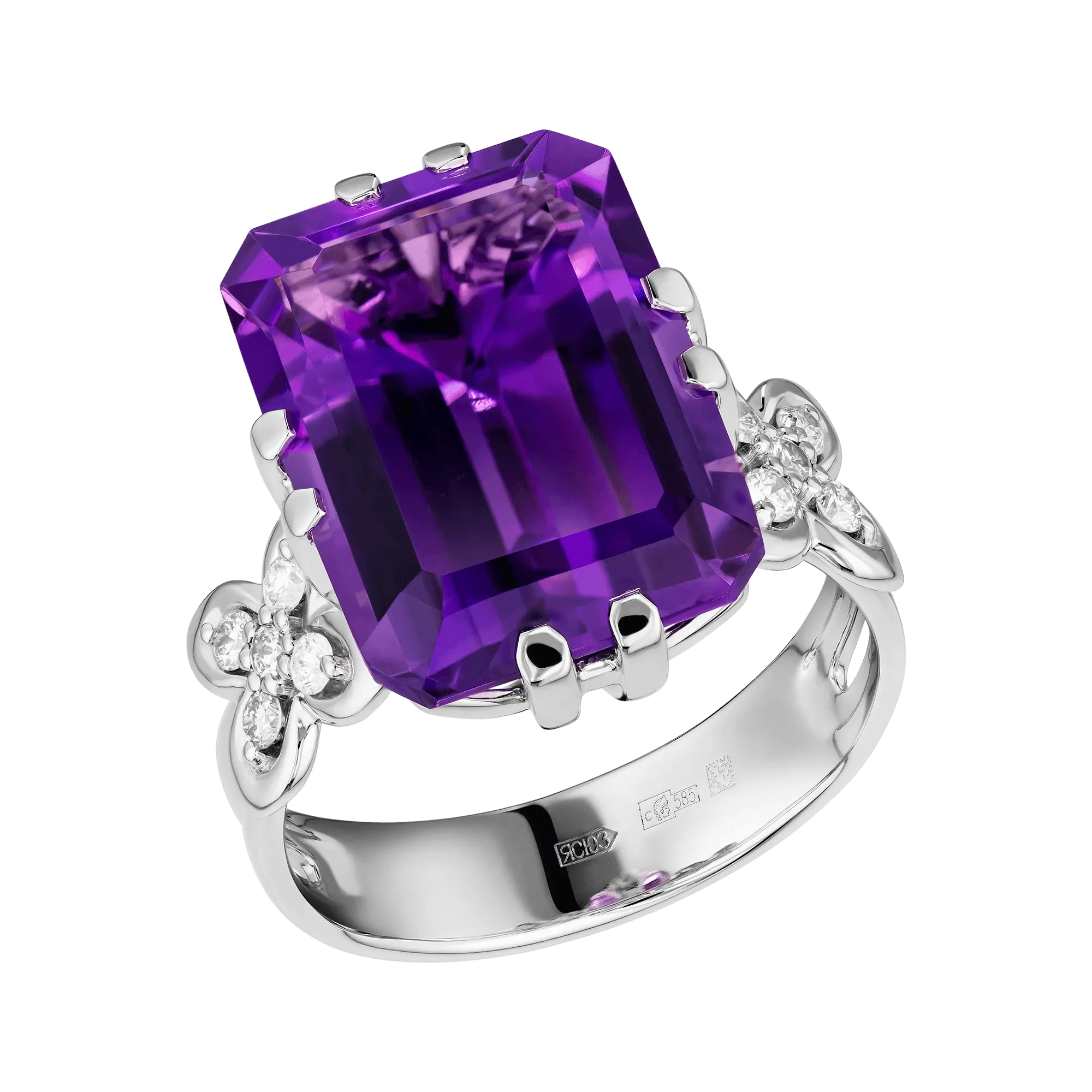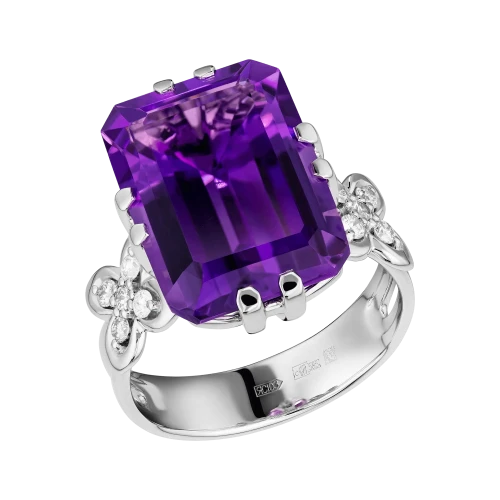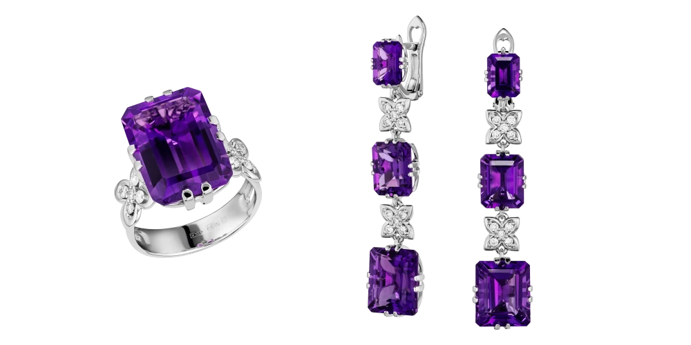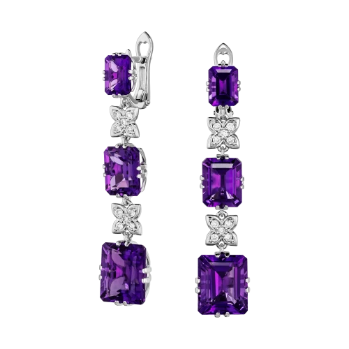 Белое золото оправы превращено мастерами Maxim Demidov в изящные цветки, усыпанные бриллиантами. Они подобны соцветиям сирени, где каждая грань отражает свет, создавая игру сияния и воздушности. Контраст холодного блеска бриллиантов и бархатной глубины аметистов рождает гармонию, в которой строгая классика встречается с живой поэзией природы.
