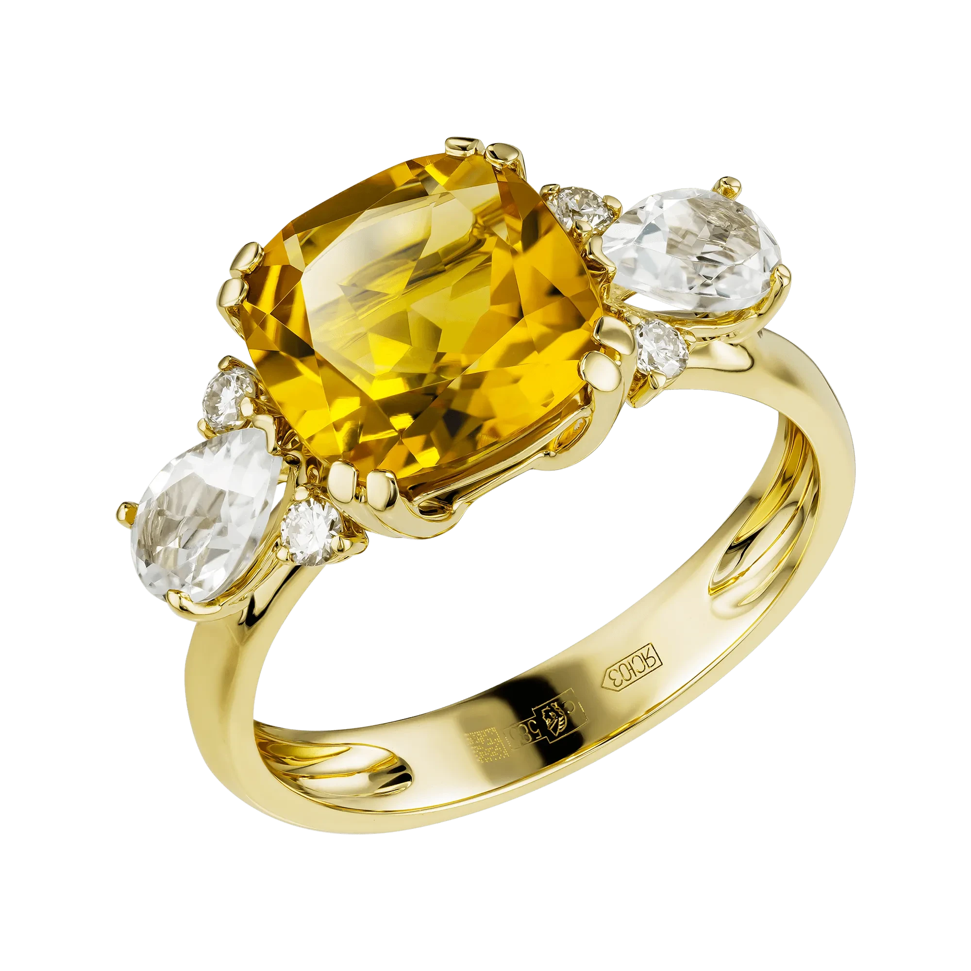 Гарнитур «Высшая нота» построен вокруг чистого, звонкого сияния цитринов — камней, чья природа словно хранит в себе солнечный тембр Бразилии. Их общий вес 2,33 карата, но визуальная сила значительно выше: каждый цитрин звучит как ведущий голос композиции, задавая её эмоциональный тон. Именно эти самоцветы становятся тем самым высоким, чистым регистром, который определяет весь образ украшения.
