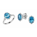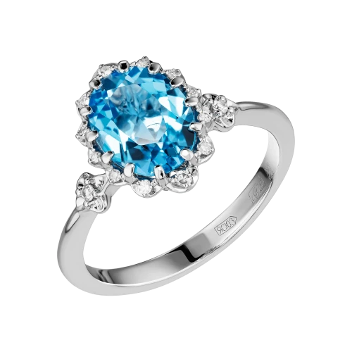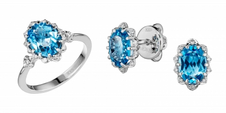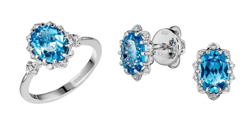 Гарнитур «Ясного дня сияние» создан как отражение безмятежного полдня, когда небо чисто, воздух прозрачен, а свет проникает во всё вокруг. В центре композиции – овальные топазы насыщенного голубого цвета, напоминающего ясный небесный купол. Их сияние придаёт образу лёгкость и внутреннюю свежесть, словно дыхание солнечного дня.