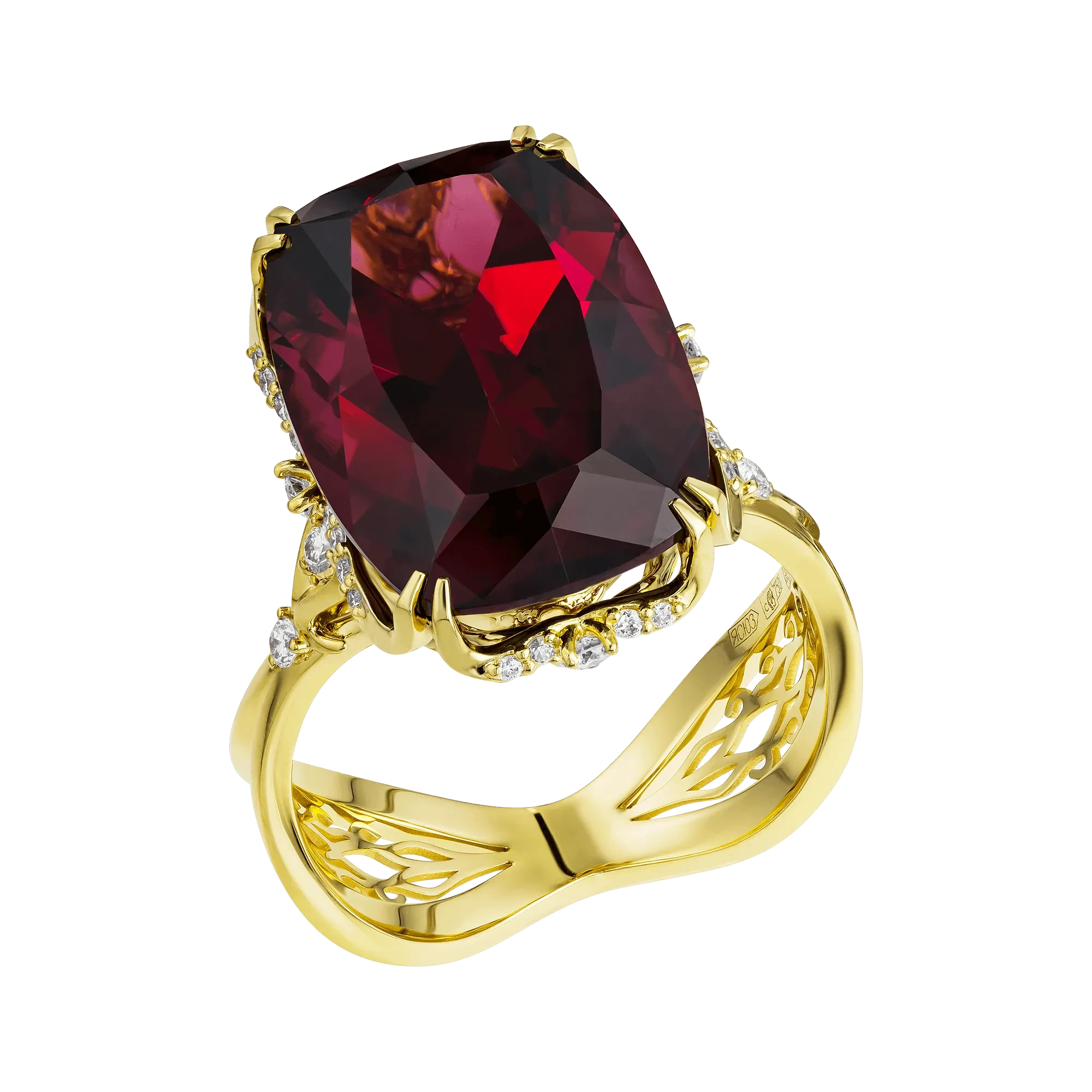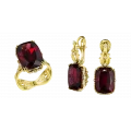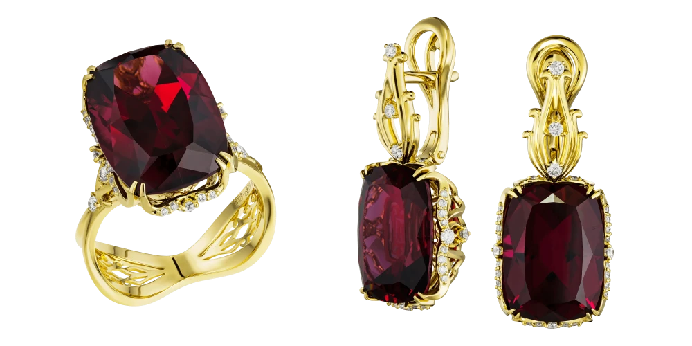 Жёлтое золото оправы усиливает теплоту самоцветов и подчёркивает их природную насыщенность. Архитектура гарнитура выстроена строго и уверенно: линии оправы удерживают крупные камни на визуальном «пьедестале», а инкрустация бриллиантов добавляет чёткие световые акценты, создавая контраст и глубину. Такое сочетание подчёркивает статус украшения и демонстрирует мастерство работы с цветом, формой и пропорциями.