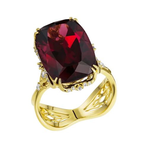 Центральную роль в композиции играют танзанийские родолиты — разновидность граната, ценимая специалистами за насыщенный винно-малиновый оттенок с тёплыми пурпурными и огненными нюансами. Камни из Восточной Африки отличаются высокой прозрачностью и живой световой отдачей: при изменении освещения цвет раскрывается многослойно, переходя от глубокого красного к оттенкам закатного жара. Именно эта сложная хроматическая природа сделала родолит востребованным среди коллекционеров и ювелиров, работающих с выразительными цветными камнями.