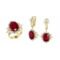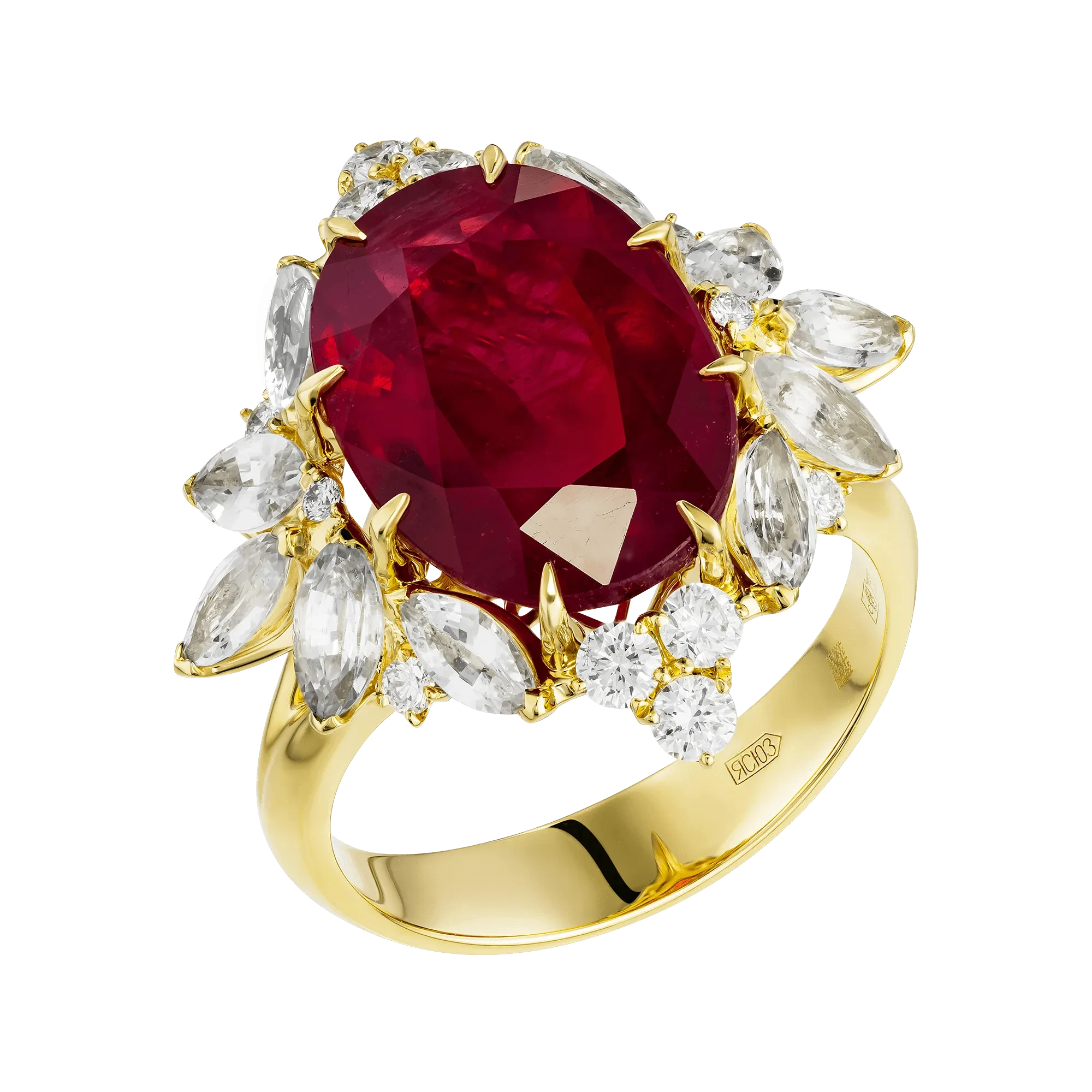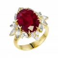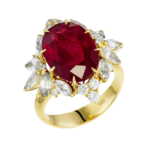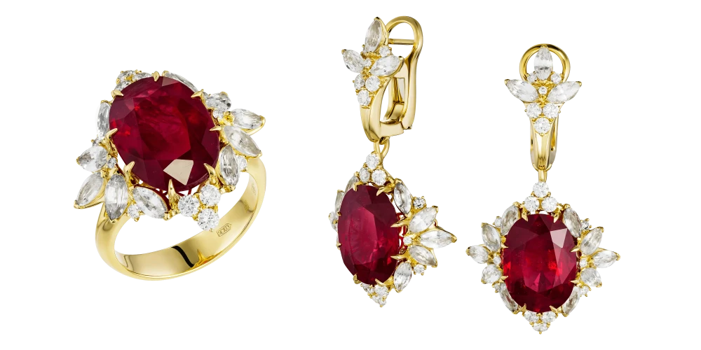 Россыпь белых сапфиров и сверкающих бриллиантов мягко поддерживает центральные камни, усиливая их сияние и создавая игру света, меняющуюся при каждом движении. Контрастное жёлтое золото обрамляет рубины теплом и светом, подчёркивая их силу и выразительность. В таком сочетании металл и камни звучат в унисон, раскрывая идею полноты и яркости момента.