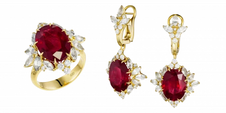 Гарнитур создан для женщины, которая чувствует вкус жизни во всех её оттенках и умеет ценить каждое мгновение. Рубины общим весом 24,02 карата звучат как пульс — насыщенно, глубоко, уверенно. Их огненный цвет притягивает взгляд и наполняет украшение внутренним движением, словно напоминая: истинная красота всегда живая.