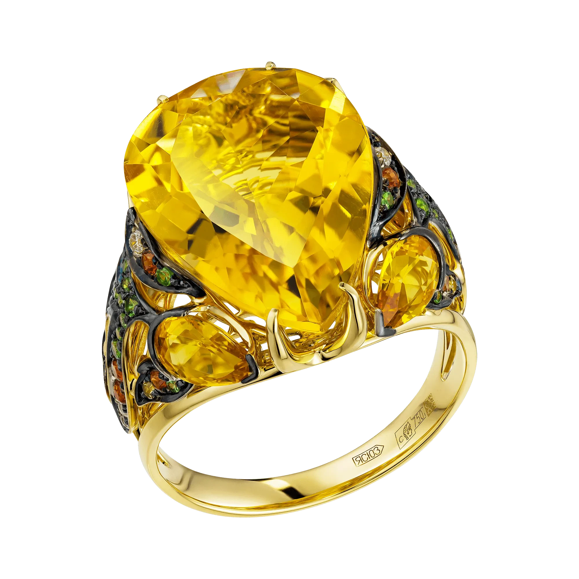 В центре композиции — крупные капли бразильских цитринов, наполненные тёплым, густым сиянием. Их прозрачный золотистый оттенок словно удерживает солнечный свет, создавая ощущение насыщенной, спокойной энергии. Открытая оправа из жёлтого золота подчёркивает природную яркость камней, позволяя им свободно взаимодействовать с движением и светом, раскрывая глубину цвета при каждом жесте.