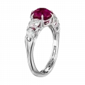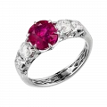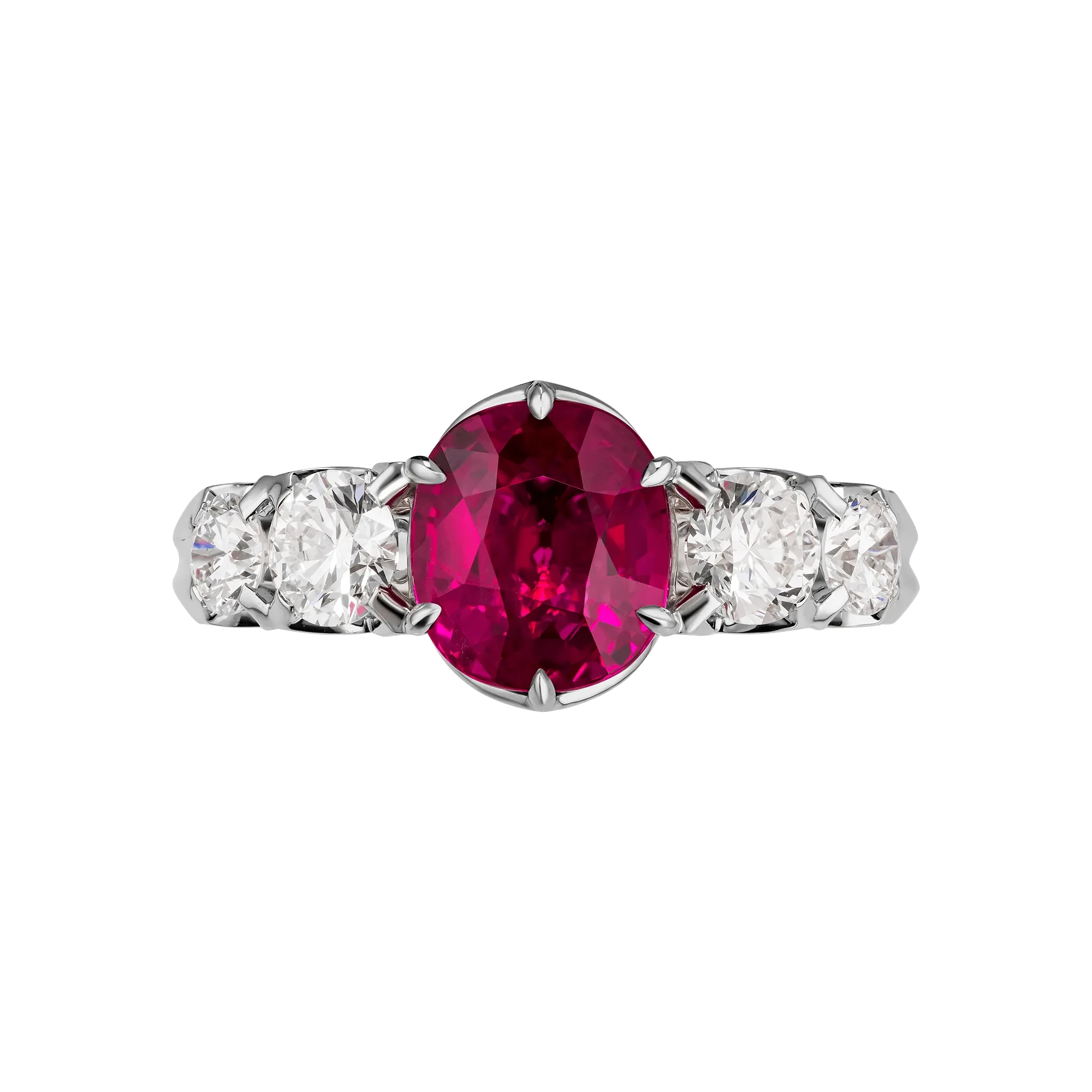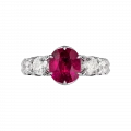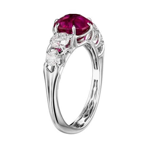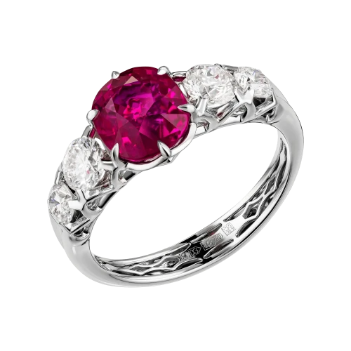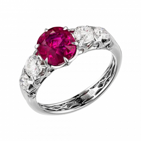 Воздушная оправа из белого золота подчёркивает архитектурную точность формы, позволяя свету свободно раскрывать глубину центрального камня. Бриллианты по бокам создают гармоничный световой баланс, усиливая яркость рубина и придавая композиции дополнительную визуальную силу. Здесь каждая грань работает не только на эстетику, но и на ощущение структурной цельности – качество, характерное для украшений инвестиционного уровня.