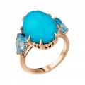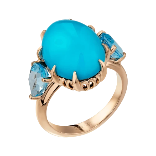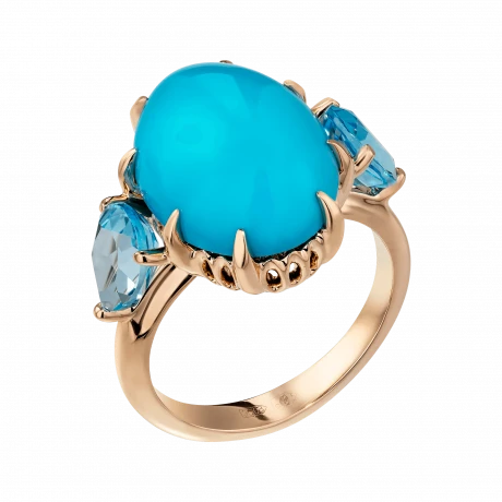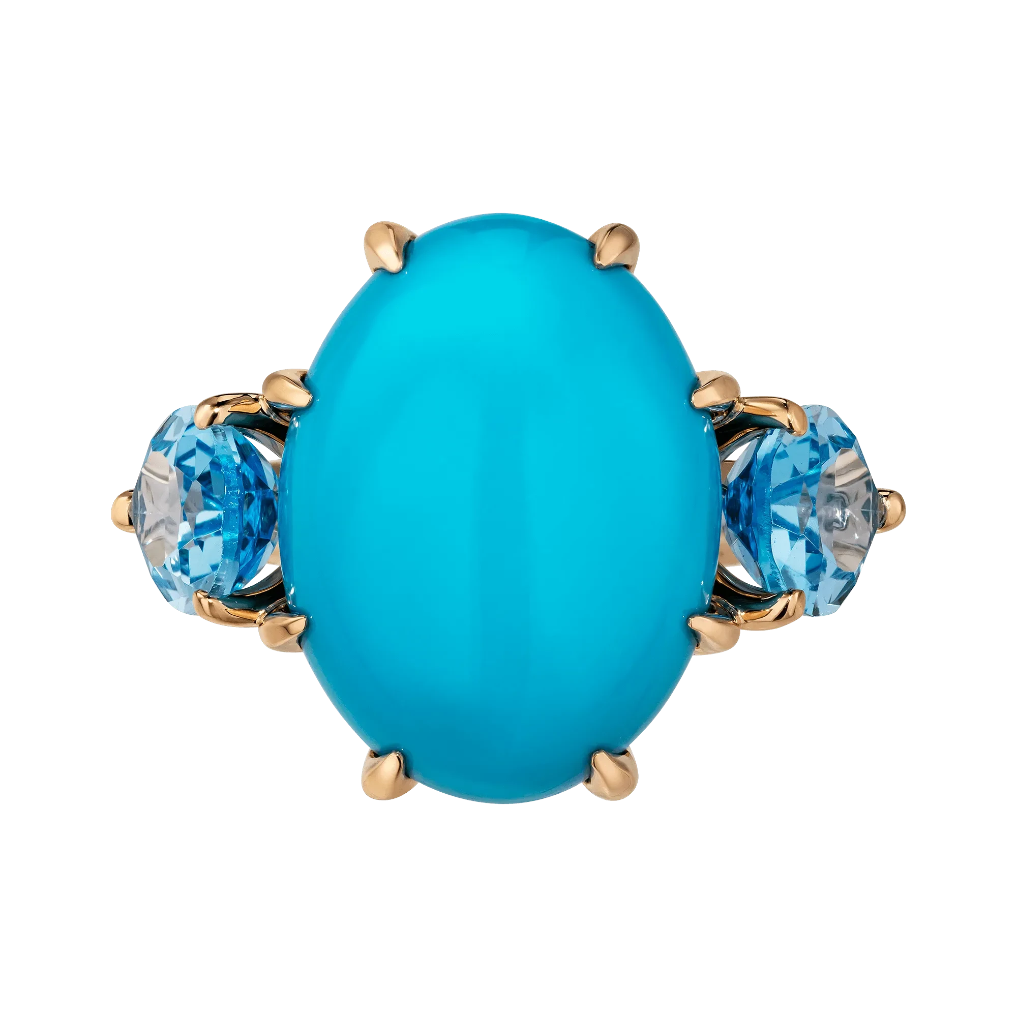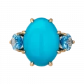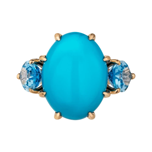 В центре эксклюзивного украшения просто бесподобно выглядит чистейшая бирюза. Голубой камень, прославленный в стихах и книгах, присутствующий на портретах королев, очарователен в желтом золоте, своей солнечностью оттеняет ясность центрального минерала. В драгоценной картине безоблачного дня с лазоревой высью гармонично смотрится тонкий штрих, искусно добавленный ювелирами – два топаза, дополняющих блеском глянцевость бирюзового кабошона.