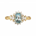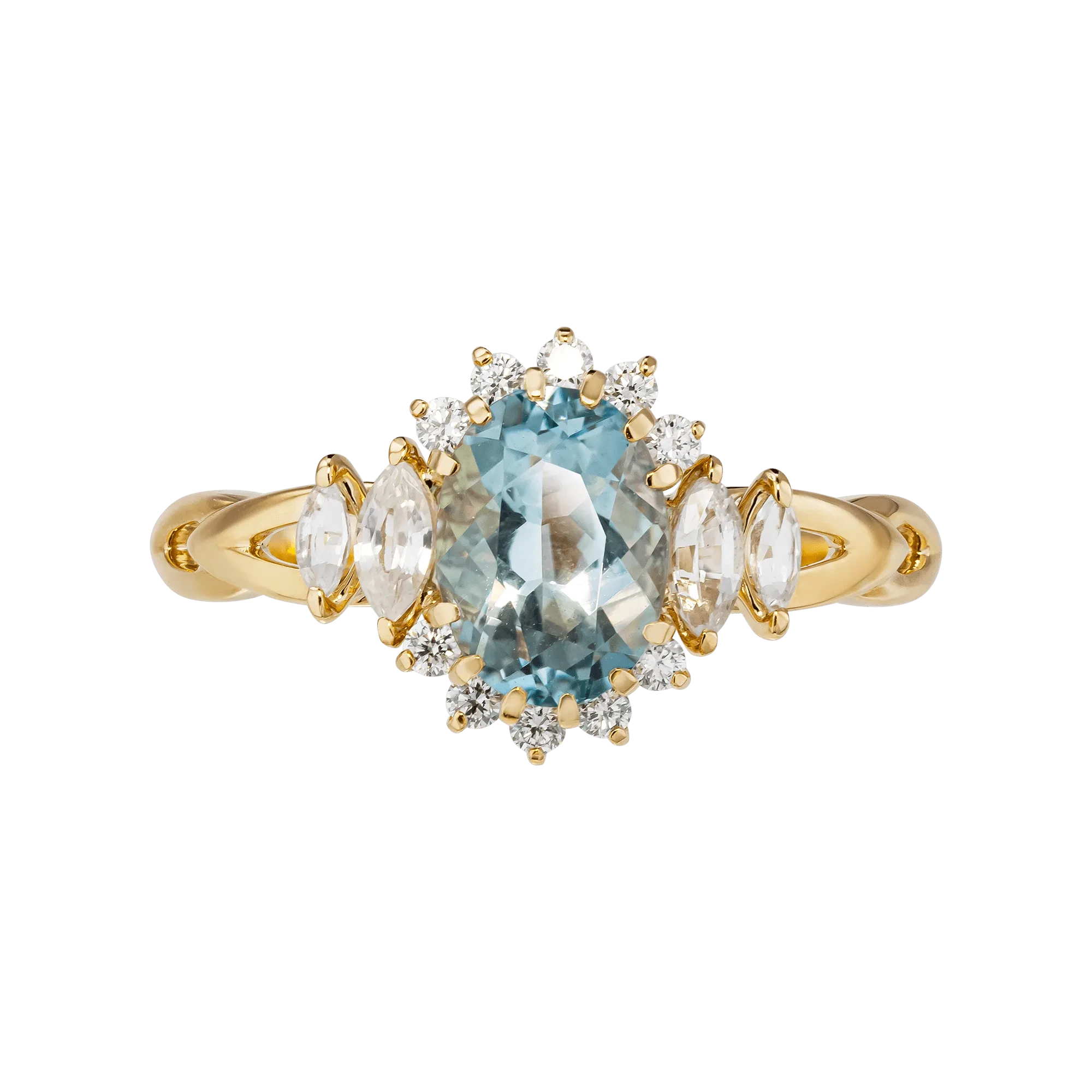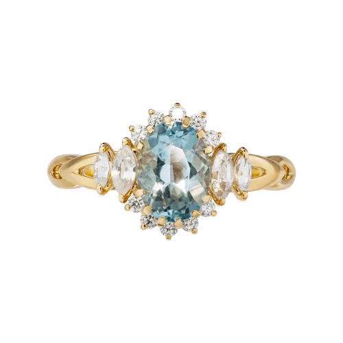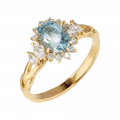 В центре обрамления гордо возвышается аквамарин из Бразилии, названный в честь чистейших морских вод. По бокам аквамарина расположены сапфиры и бриллианты, подчеркивая элегантность и мастерство огранки центрального камня. Они словно звезды на ночном небе острова, дополняют и обогащают сияние аквамарина, придавая кольцу дополнительную глубину и великолепие.
