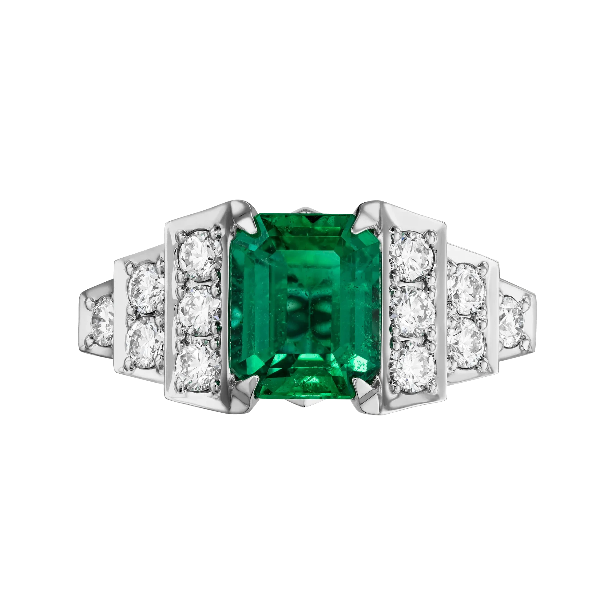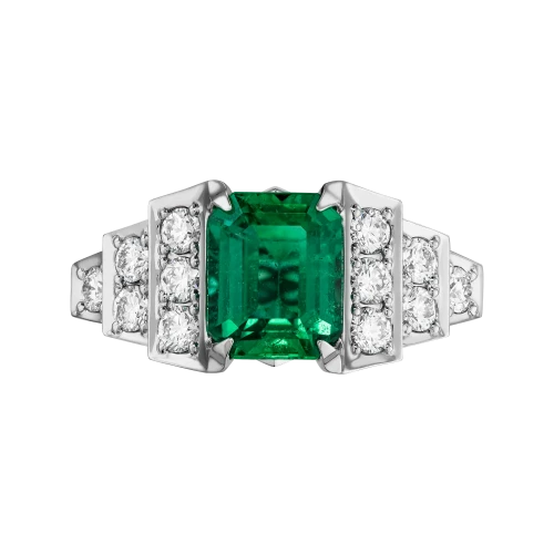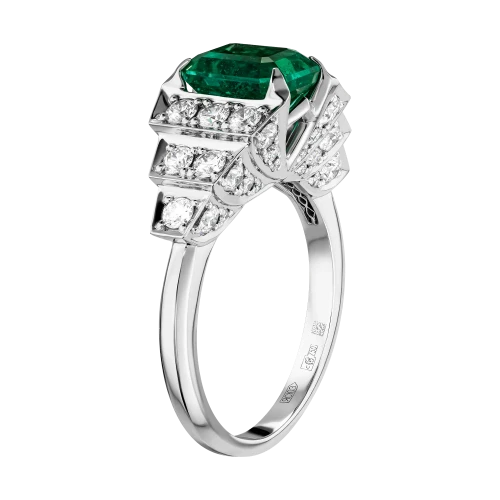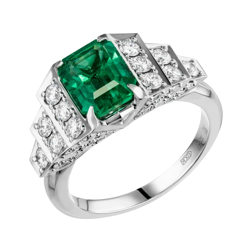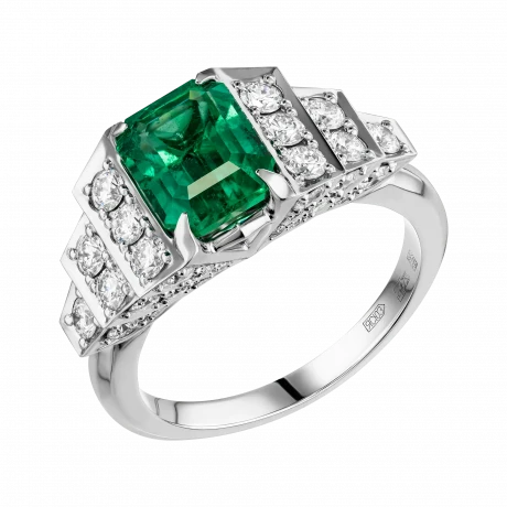 В центре кольца сияет уральский изумруд весом 2,07 карата – драгоценный камень удивительной чистоты и насыщенности цвета, напоминающий прохладную глубину воды в чаше фонтана. Его природное происхождение и исключительное качество подтверждены швейцарским сертификатом GFCO GEM LAB. Яркость изумруда поддерживают бриллианты, расположенные по бокам, словно солнечные блики на струях воды.
