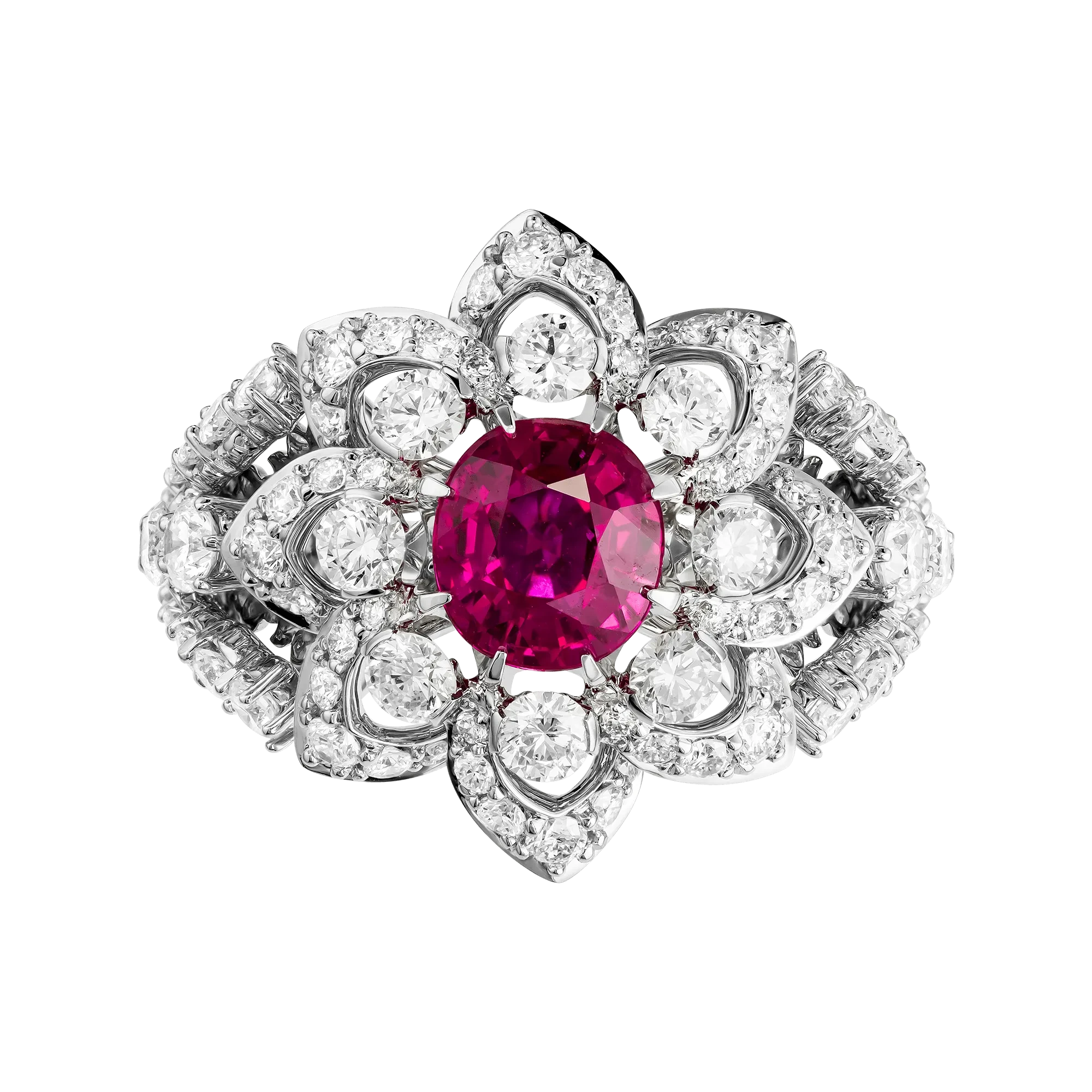 Рубин окружён сложным соцветием из бриллиантов, выстроенным по принципу объёмного светового рельефа. Такое решение усиливает глубину центрального камня и создаёт характерный для барочной эстетики эффект движения и избыточного сияния, где каждый элемент работает на раскрытие эмоциональной силы композиции. Белое золото оправы служит нейтральной архитектурной основой, позволяя цвету и свету доминировать без визуального утяжеления.