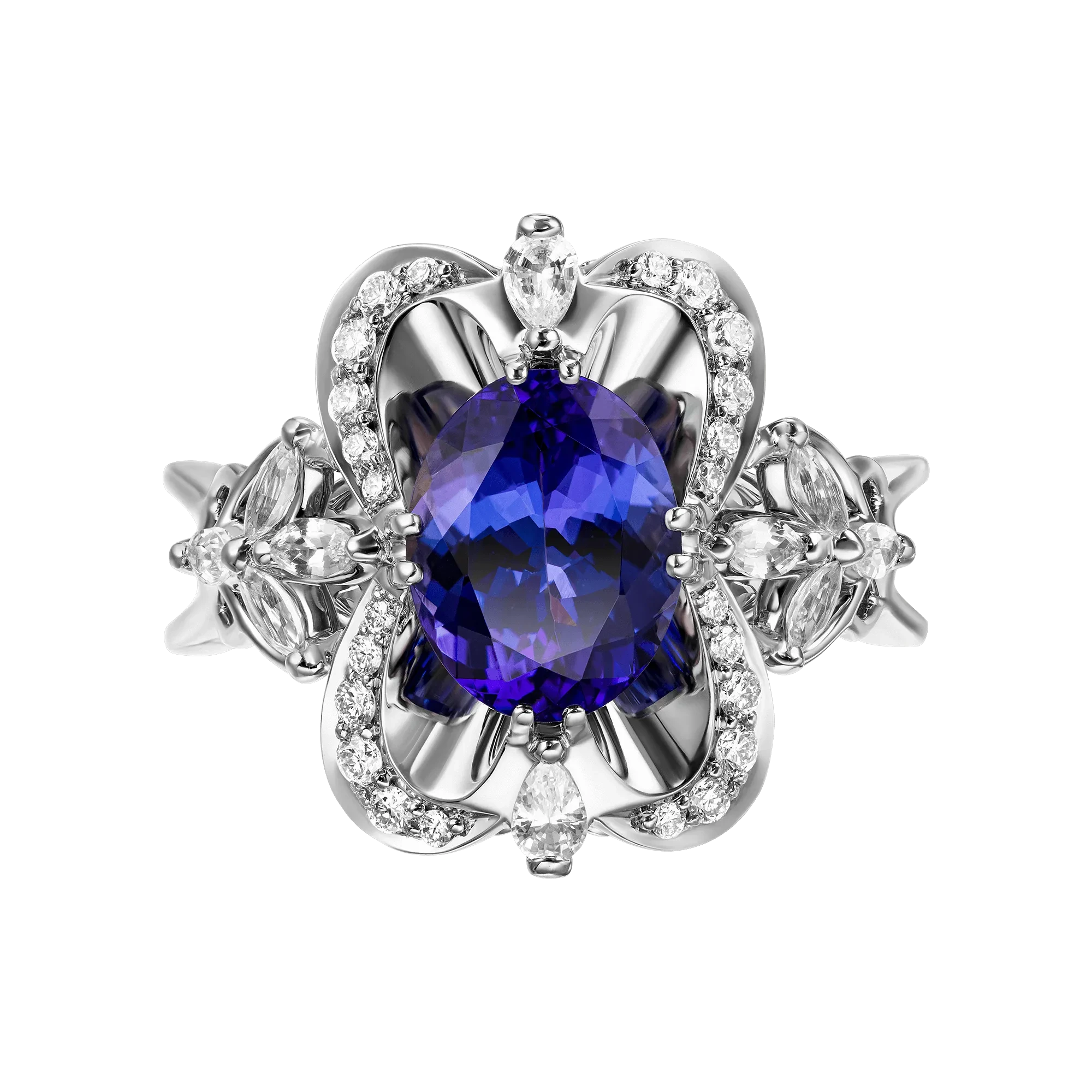 В центре композиции сияет крупный танзанит, заключённый в зеркальную чашу из белого золота. Его насыщенный сине-фиолетовый оттенок переливается бархатными полутонами, будто отражая игру света на парчовых тканях старинных дворцов. Драгоценный камень кажется живым – в его глубине мерцает внутренний огонь, рождающий ощущение движения и эмоционального напряжения.