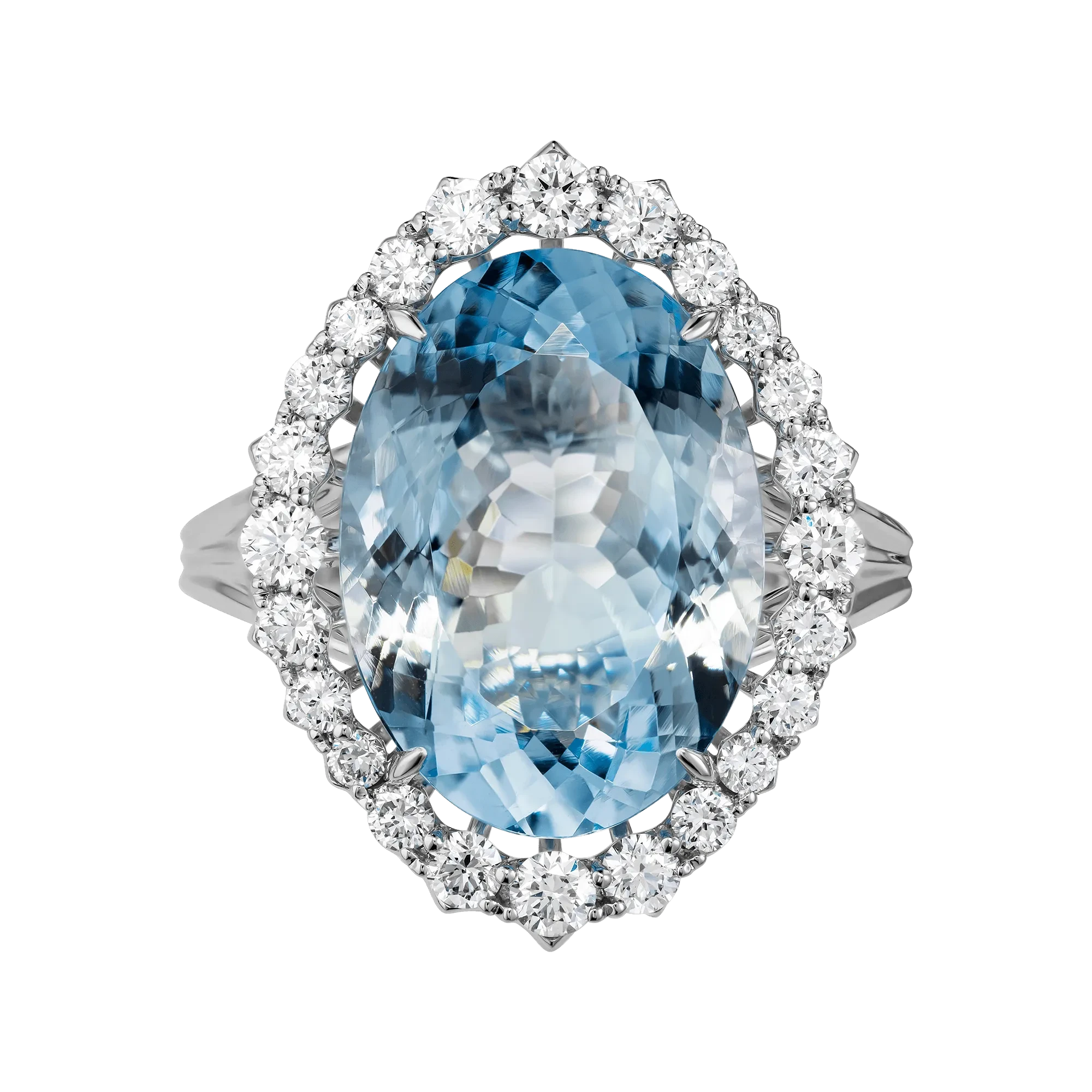 Оправа из белого золота, расшитая бриллиантами, подчёркивает кристальную чистоту и внутреннее свечение аквамарина. Свет, скользящий по его граням, создаёт иллюзию движения – будто кольцо хранит в себе вечный трепет океана.