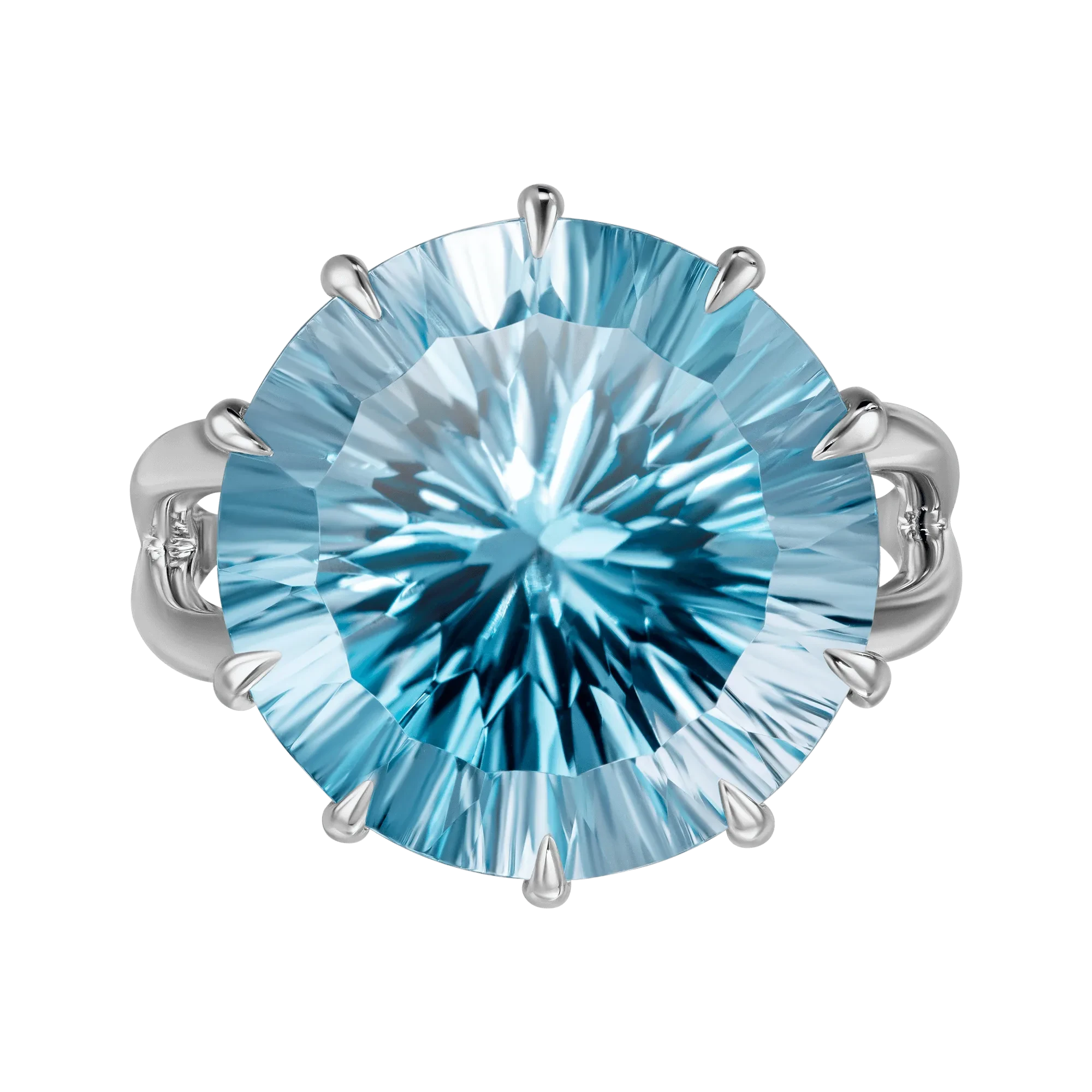 Белое золото оправы, представленное тонкими элегантными линиями, лишь слегка касается лазури виртуозно ограненного центрального минерала, добытого в экзотической Бразилии, где жители так любят сочетать страсть танца со встречами заката на пляже.