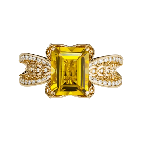 Ажурная оправа из золота выстроена как игра солнечных линий, пропускающих свет сквозь форму. Бриллианты поддерживают композицию лёгкими вспышками, добавляя ритм и глубину сиянию центрального камня. «Бразильское солнце» — кольцо о тепле, которое не зависит от времени года и становится личным источником света.