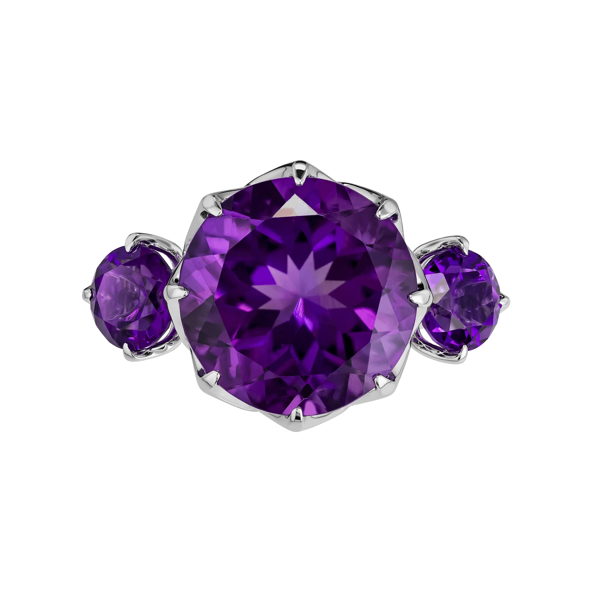 Центральный камень притягивает взгляд густым фиолетовым тоном с бархатной мягкостью оттенка. Его сияние не вспыхивает резко — оно раскрывается постепенно, словно сумеречный свет, который медленно наполняет пространство. Боковые аметисты поддерживают композицию, усиливая цветовую глубину и создавая эффект объёма, где каждый отблеск грани продолжает общий ритм.
