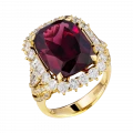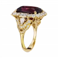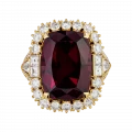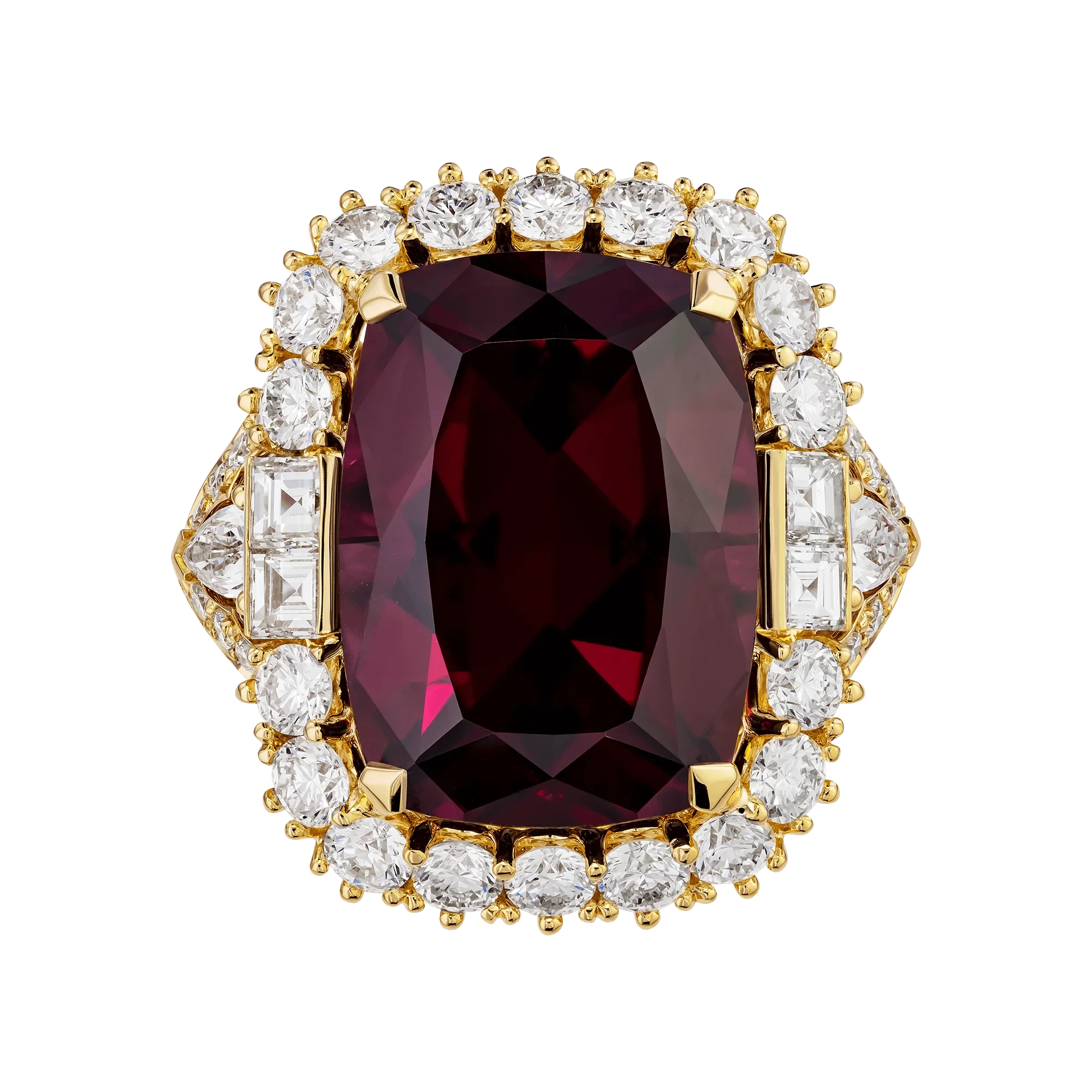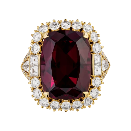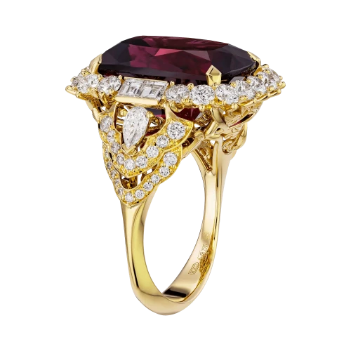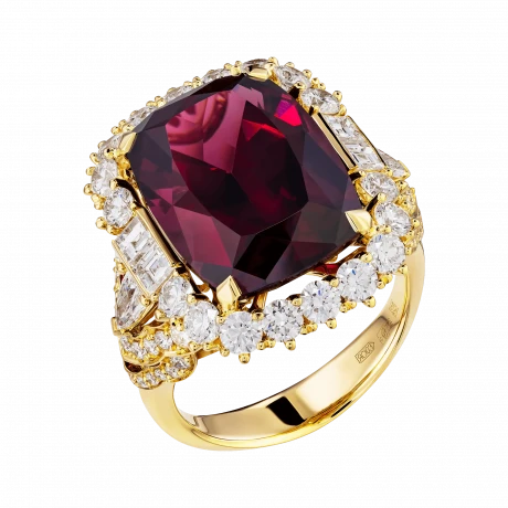 В центре композиции – родолит, будто капля вина, подогретого специями и временем. Его цвет ускользает от прямого определения: он и гранатовый, и бордовый, и оттенок густого кармина – словно тёплый шёлк, струящийся сквозь пальцы. Драгоценный камень заключён в оправу из жёлтого золота, как будто покоится в чаше света. А по её краю – бриллианты, рассыпанные, как утренняя роса на лепестках лотоса, прозрачные, но наполненные сиянием.