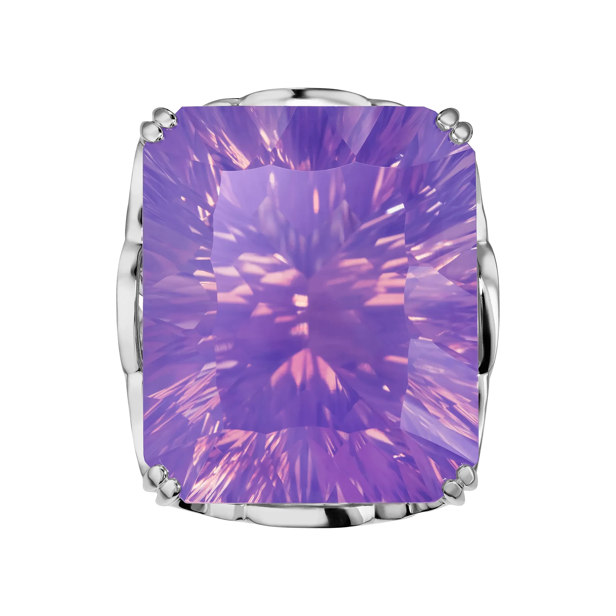 В центре композиции сияет лавандовый аметист весом 34,58 карата – редкий природный камень с мягким переливом света, который словно дышит изнутри. Его полупрозрачное свечение напоминает ранний рассвет, когда небо окрашивается в утончённые сиреневые тона, пробуждая чувства и мысли. Аметисты такого оттенка ценятся не только за красоту, но и за особую энергетику, способную гармонизировать внутренний мир.