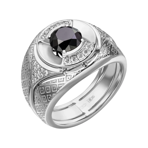 Мощным импульсом к благородным действиям, которые обязательно принесут владельцу кольца личный успех, как финансовый, так и эмоциональный, стала россыпь чистейших бриллиантов, среди которых особенно выделяется черный экземпляр весом 1,68 карат, необычайно ценимый за редкость и в буквальном смысле ярко отображающий брутальность украшения. Насыщенный цвет центрального кристалла идеально гармонирует с белым золотом оправы, удивляющей тонко нанесенным на нее узором, как будто визуализирующим мощную энергетику ювелирного шедевра.