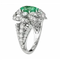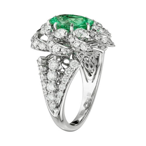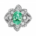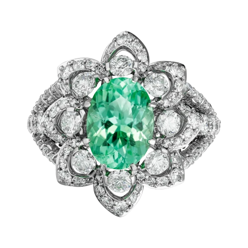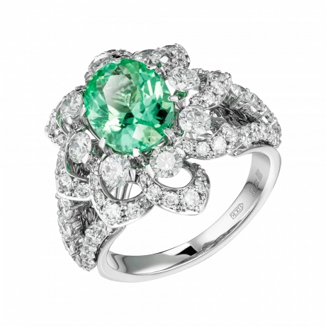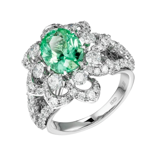 В центре композиции – редчайший турмалин Параиба из Мозамбика весом 2,90 карата. Драгоценные камни такого качества принадлежат к числу наиболее востребованных в мире – их добыча крайне ограничена, а уникальная окраска обусловлена присутствием меди и марганца, создающих эффект живого люминесцентного свечения. Оправа из белого золота, полностью выложенная бриллиантами, подчеркивает уникальный цвет Параибы, превращая кольцо в классическое произведение, достойное семейной коллекции.