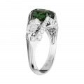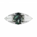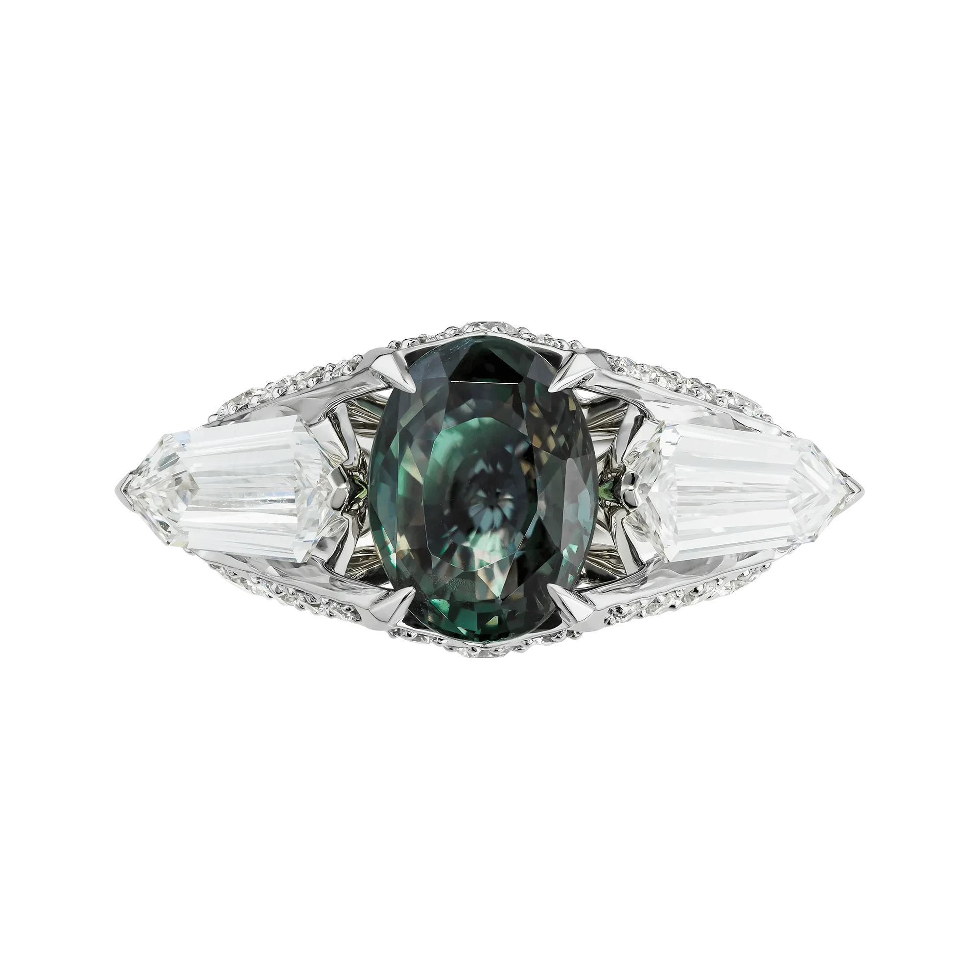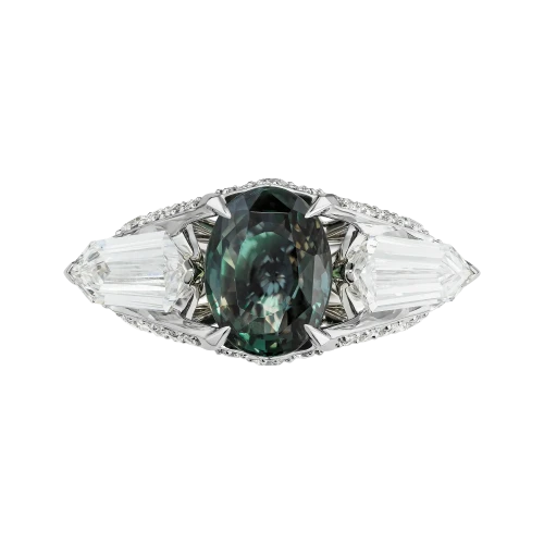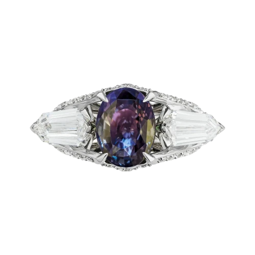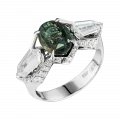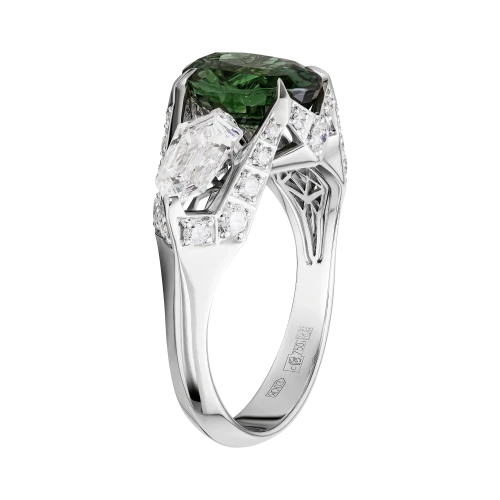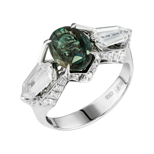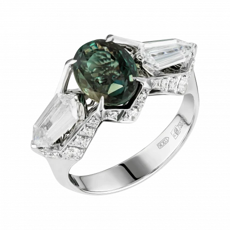 Уникальность самоцвета подчёркивают два крупных фантазийно огранённых бриллианта по обе стороны, создающие эффект визуального равновесия. Основа из белого золота с выразительной геометрией линий дополнена россыпью бриллиантов, усиливающих ощущение глубины, света и безупречной ювелирной гармонии.
