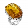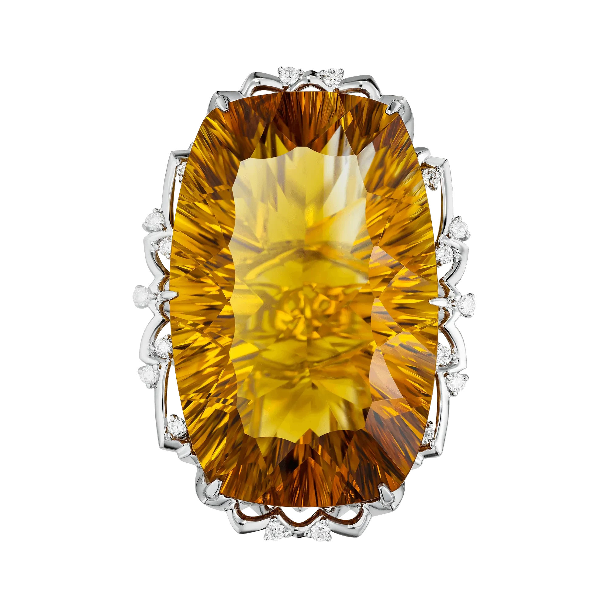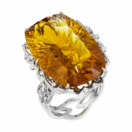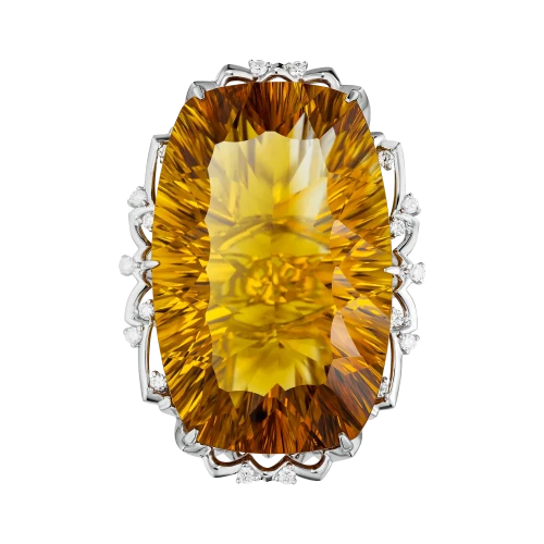 Центральный цитрин весом 44,73 карат словно вобрал в себя энергию полуденного солнца, его густые золотисто-медовые оттенки переливаются живым светом, создавая ощущение бесконечного движения. В глубине камня угадывается мягкая пульсация — будто свет дышит, наполняя пространство вокруг тихим, согревающим сиянием. Это не яркость, требующая внимания, а свет, к которому хочется приблизиться.