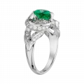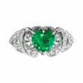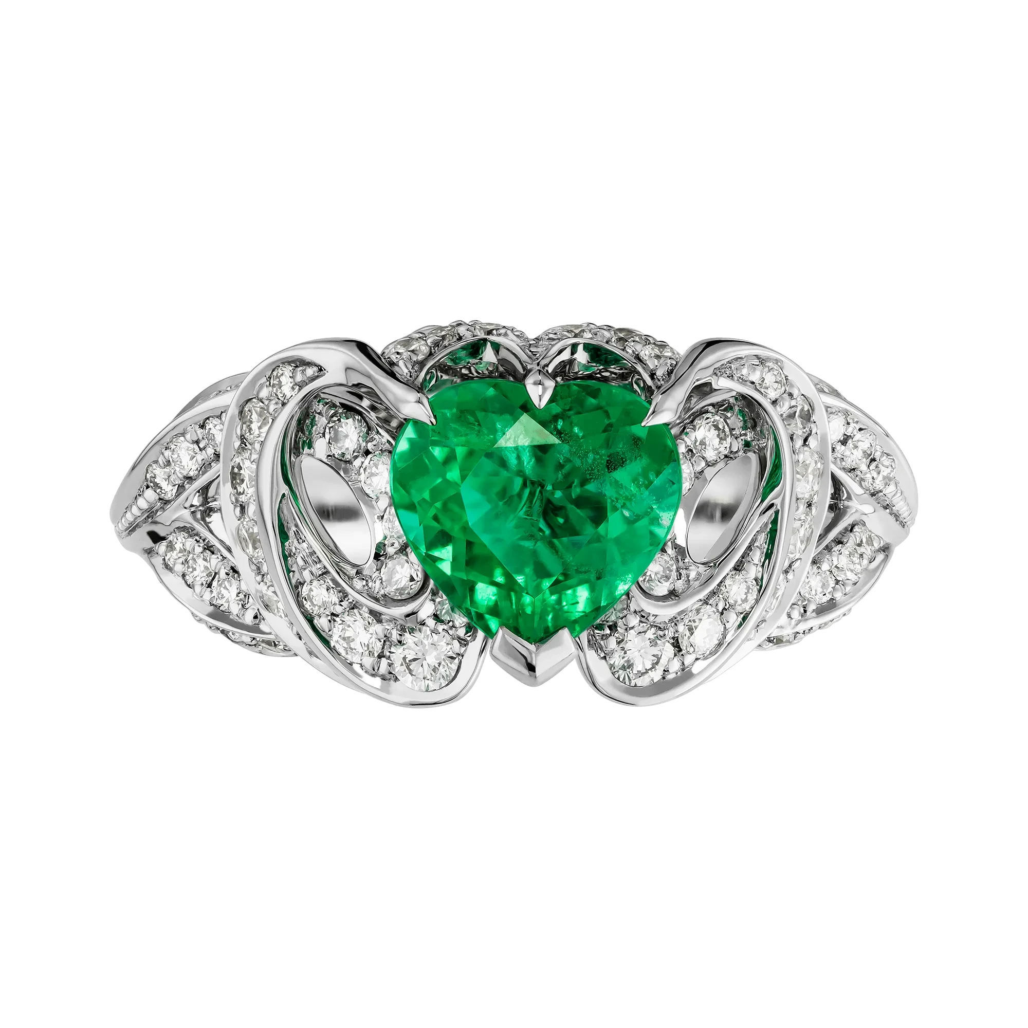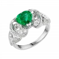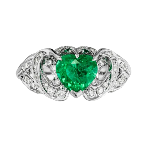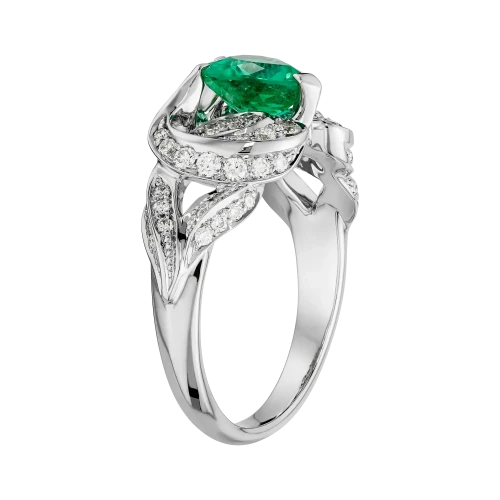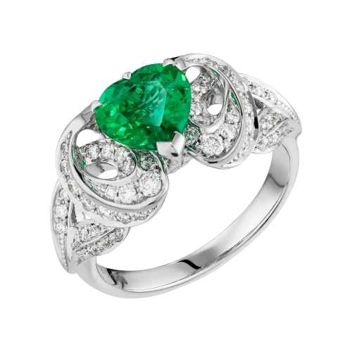Ажурная оправа из белого золота выстроена как архитектура света. Линии металла образуют тонкое кружево, в которое вплетена россыпь бриллиантов. Их холодное сияние усиливает насыщенность изумруда и создаёт ощущение лёгкого свечения вокруг центрального камня.