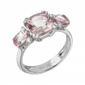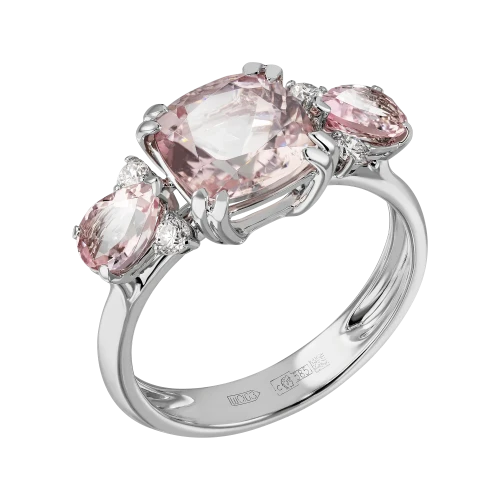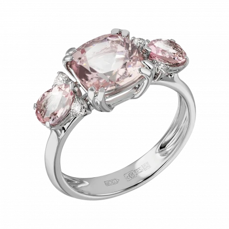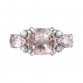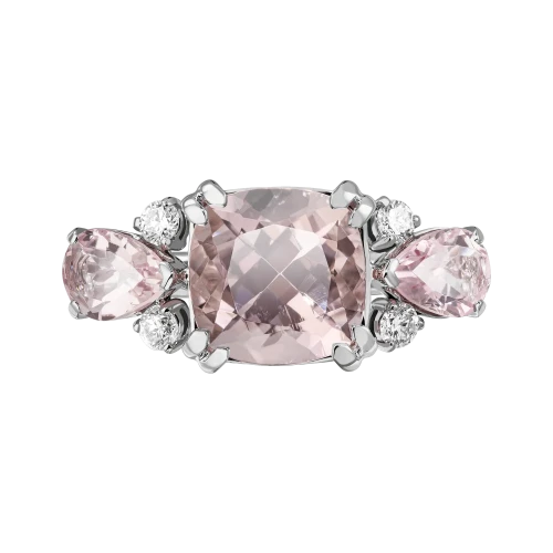 Главным «ароматом» украшения, по-весеннему приятным и напоминающим о цветении сакуры, стали три чистейших морганита. Закрепленное в лаконичную оправу из белого золота таким образом, чтобы можно насладиться  достоинствами пудровых самоцветов со всех сторон, центральное трио элегантно, без кричащего вызова, контрастирует бриллиантами, демонстрируя в этой гармонии единую прозрачность.